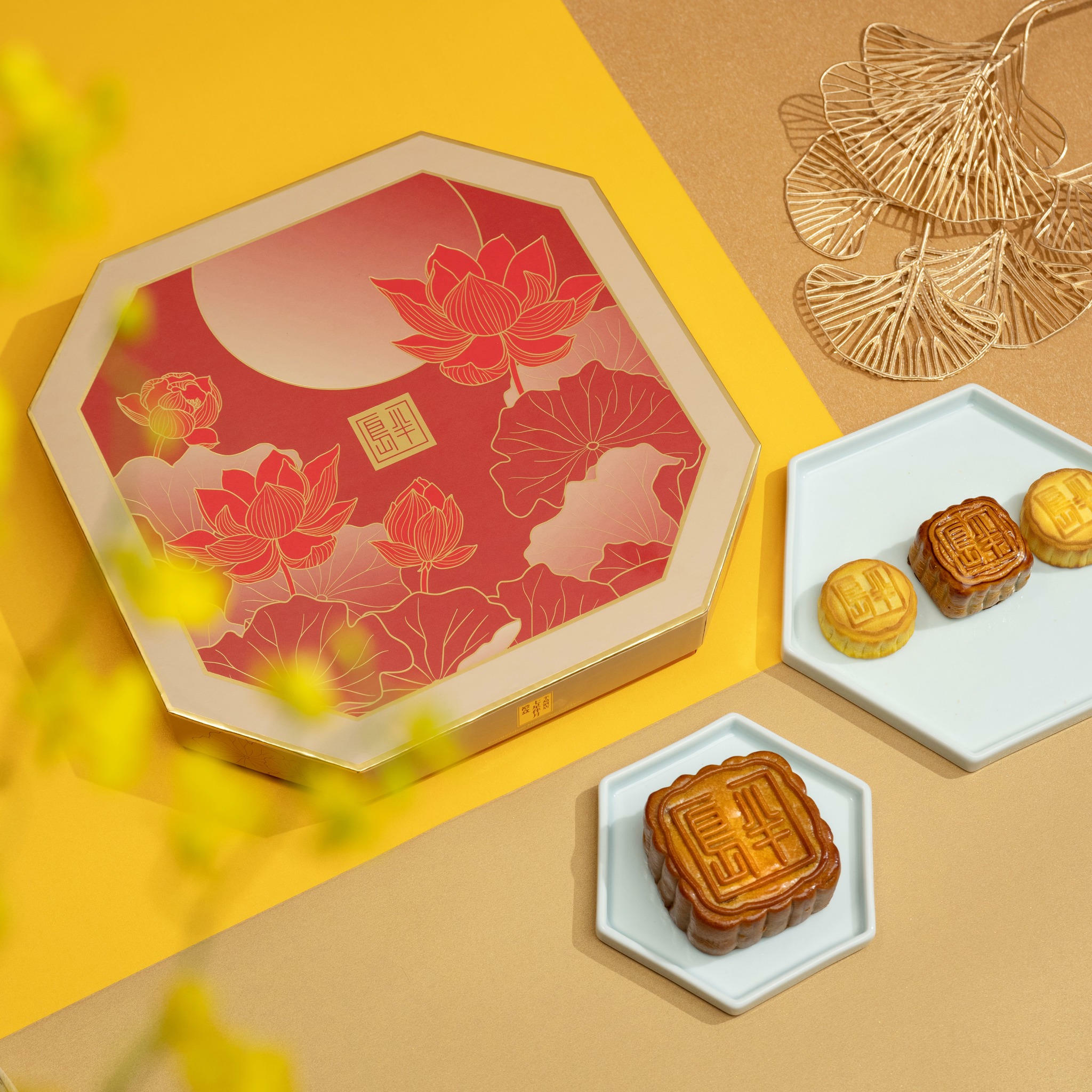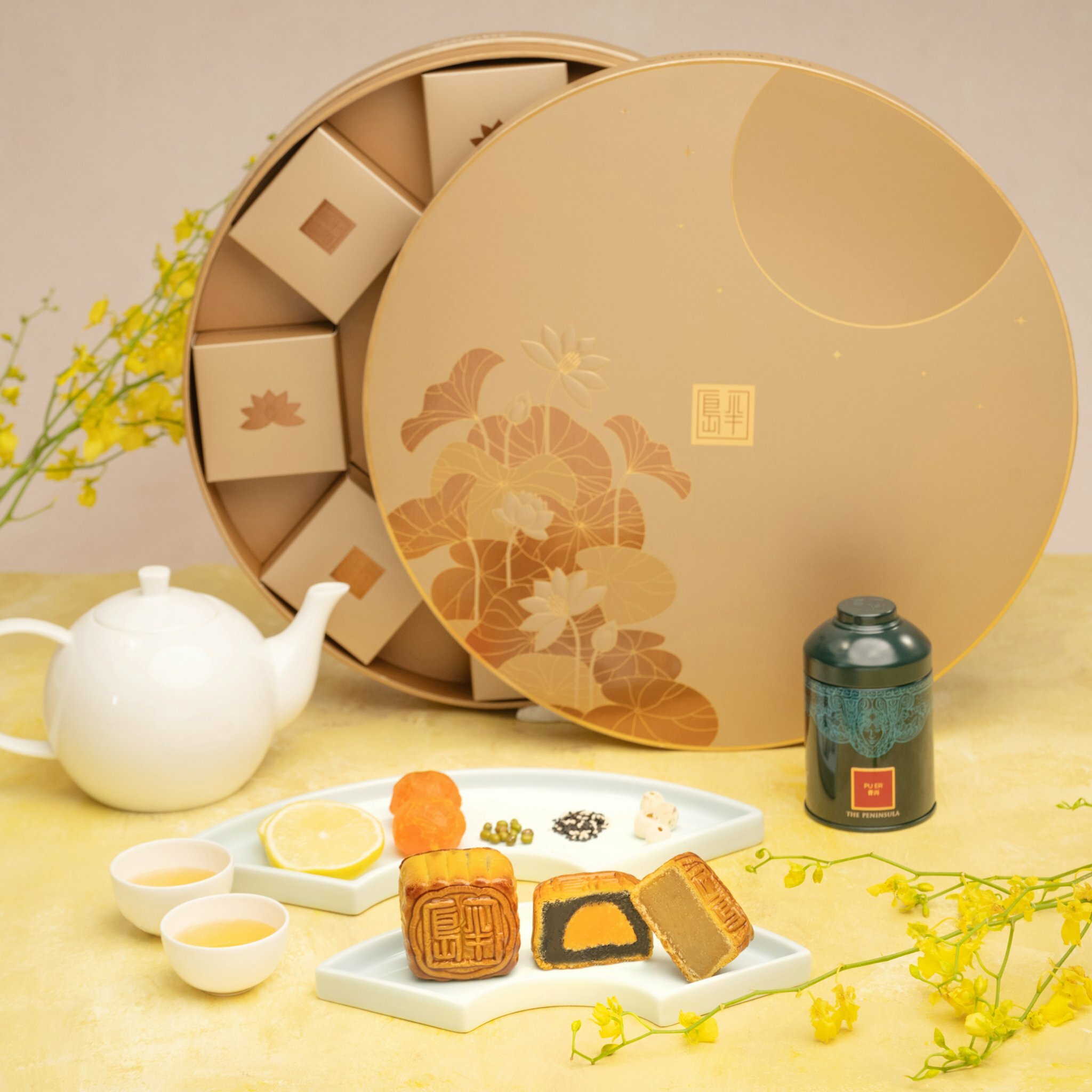 星廚月餅禮盒華美精緻,香檳色禮盒上的半島經典蓮花圖案裝飾優雅大方,星廚圓月禮盒盛載兩款全新口味月餅(蛋黃芝麻豆蓉和鹹檸檬白蓮蓉)各四個,另配有一罐陳年普洱茶葉,與親友用以沏茶賞月,別有一番雅興。