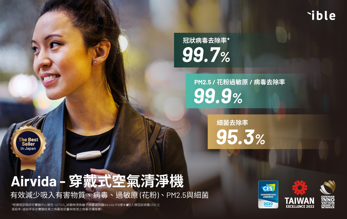 ible Tech.長期深耕空汙與過敏原問題,2015年成立,首推世界最輕巧的穿戴式空氣清淨機Airvida,可有效減少吸入空氣中病毒、過敏原、PM2.5與細菌,可隨時隨地帶給人們清淨空氣。