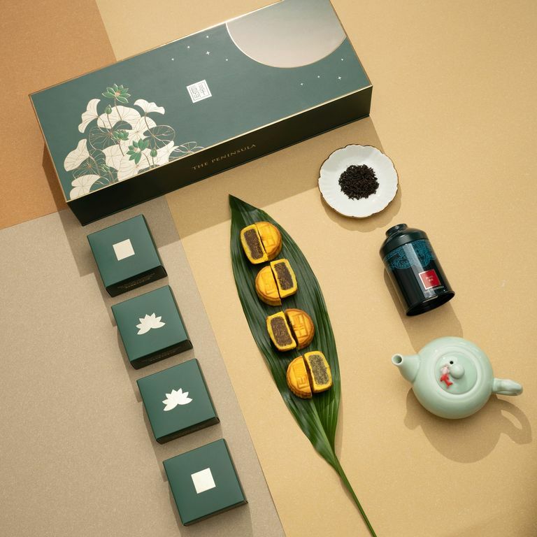 內容物:迷你荔枝味紅茶奶黃月餅X2、迷你伯爵茶奶黃月餅X2、迷你鐵觀音奶黃月餅X2、迷你半島精選名茶奶黃月餅X2、普洱茶(一罐 / 35克)