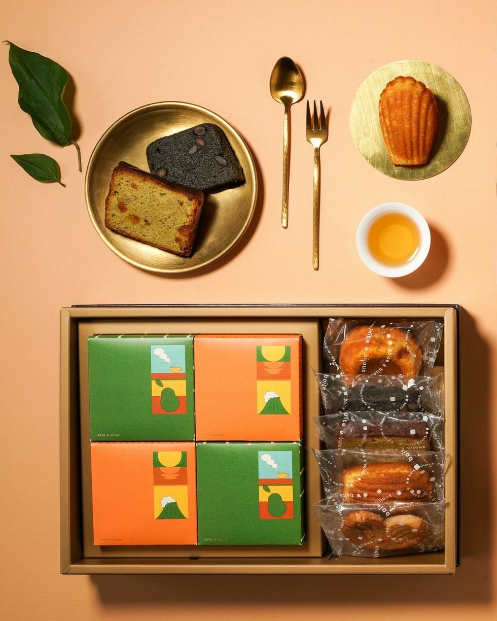 內容物:普洱茶費南雪、四季春費南雪、蜜香桂圓瑪德蓮、鐵觀音柑橘蛋糕、包種茶達可瓦茲、白牡丹貓舌餅乾、碧螺春雪球、紅玉黃茶茶罐