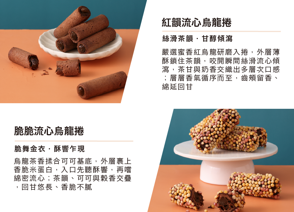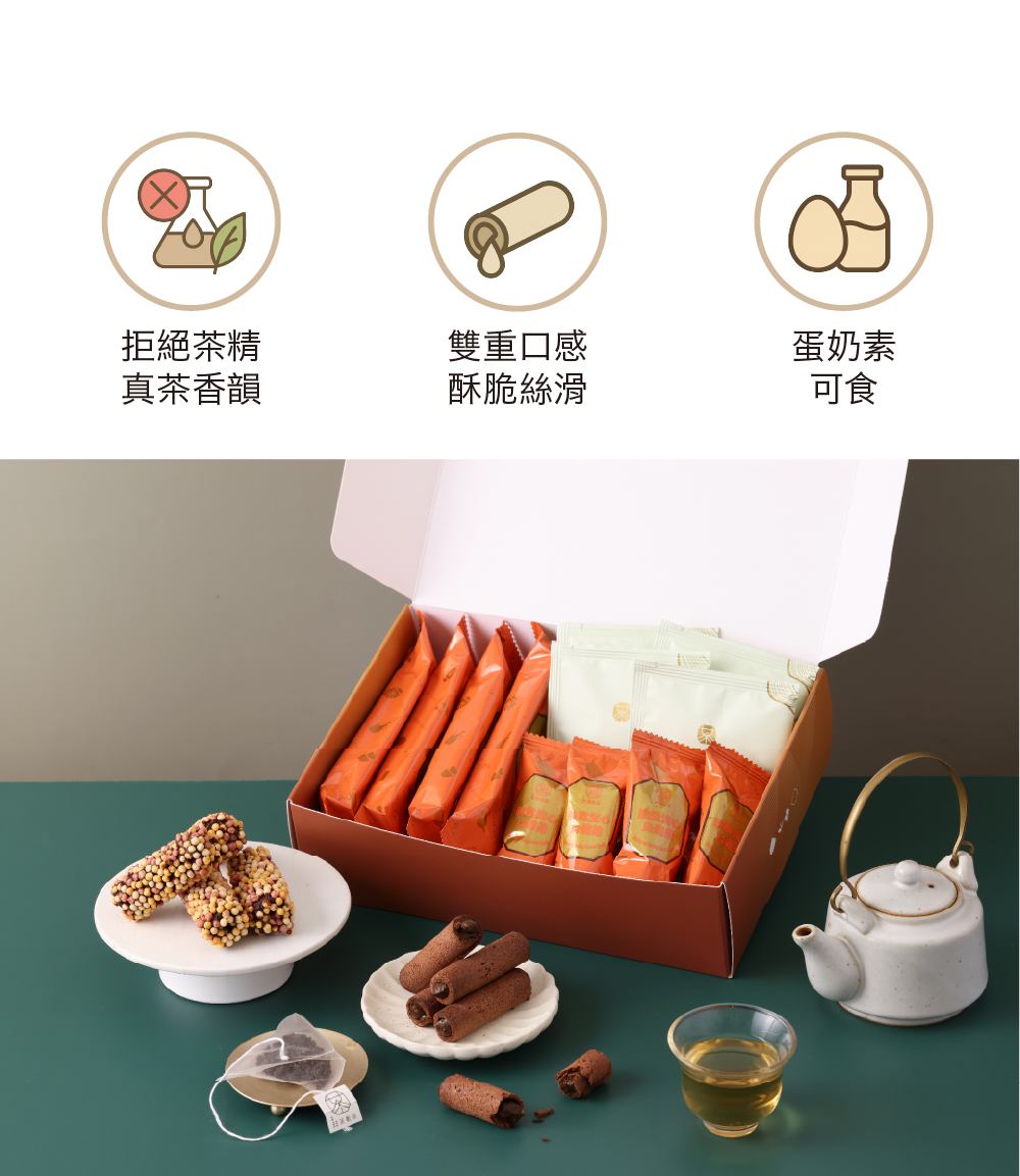紅韻流心、金脆流心與烏龍茶包匯聚一盒,真茶焙香、雙重口感、質感禮盒;蛋奶素可食
