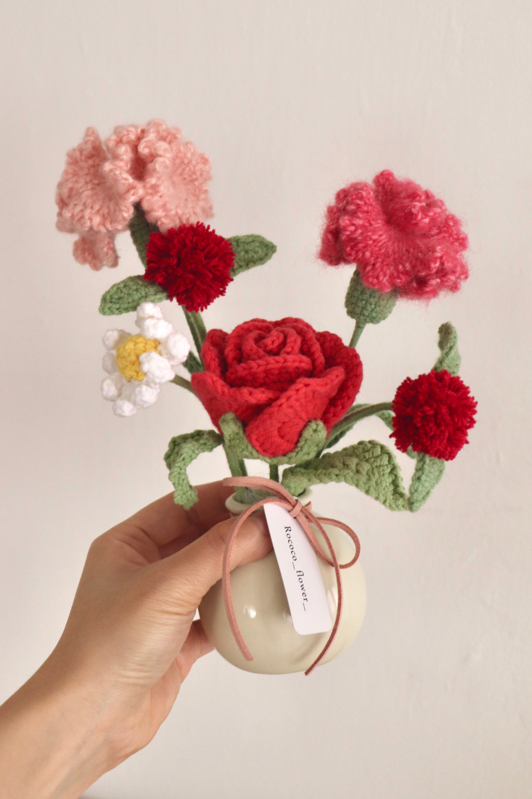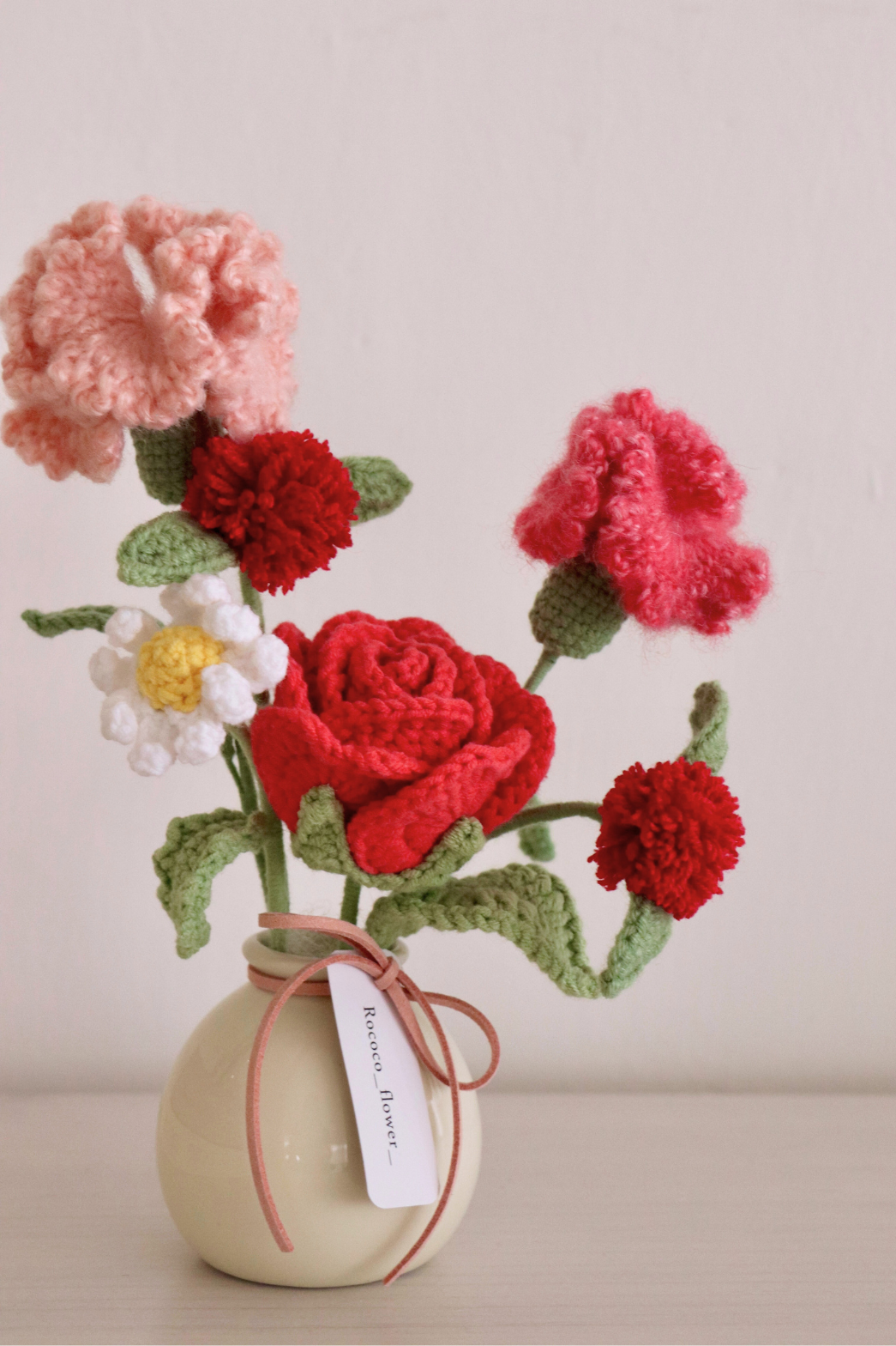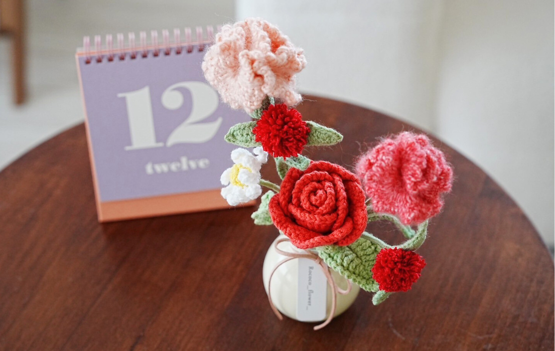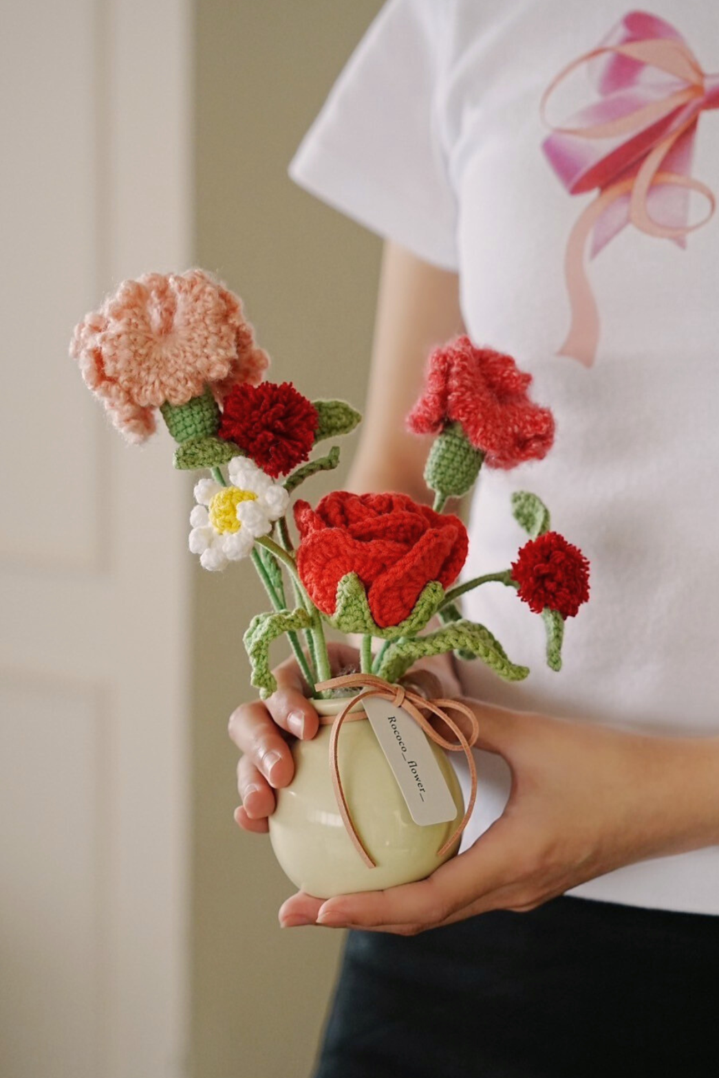 小巧圓潤的精緻花器長出馨花朵朵,以厚實蓬鬆線材織出的康乃馨、千日紅,圓滾滾的模樣十足可愛、滿分討喜!