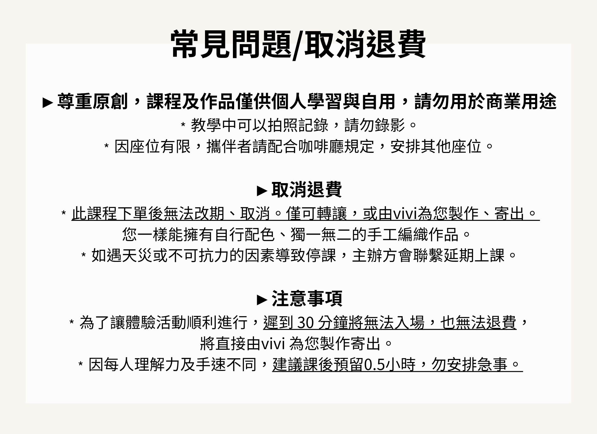 » 活動將於開始前10分鐘開放入場,因製作進度依個人速度略有差異,建議課後預留約0.5小時,避免安排緊湊行程。