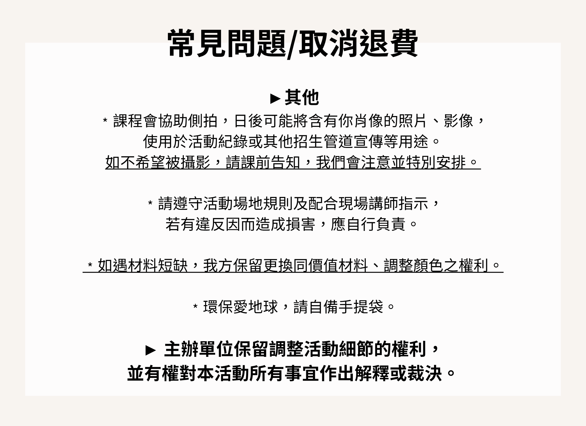 » 當您完成報名及付款手續,即表示「確認並同意取消退費事項」。