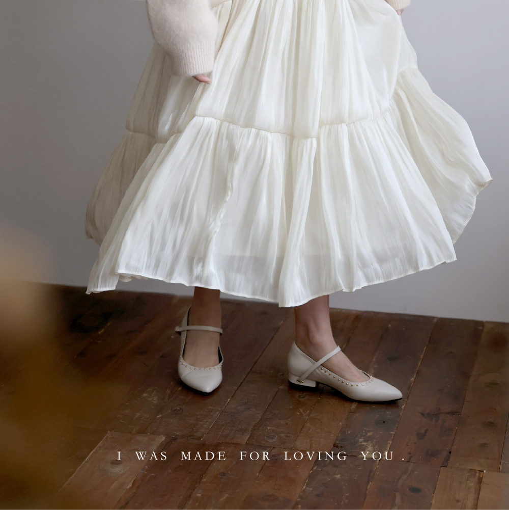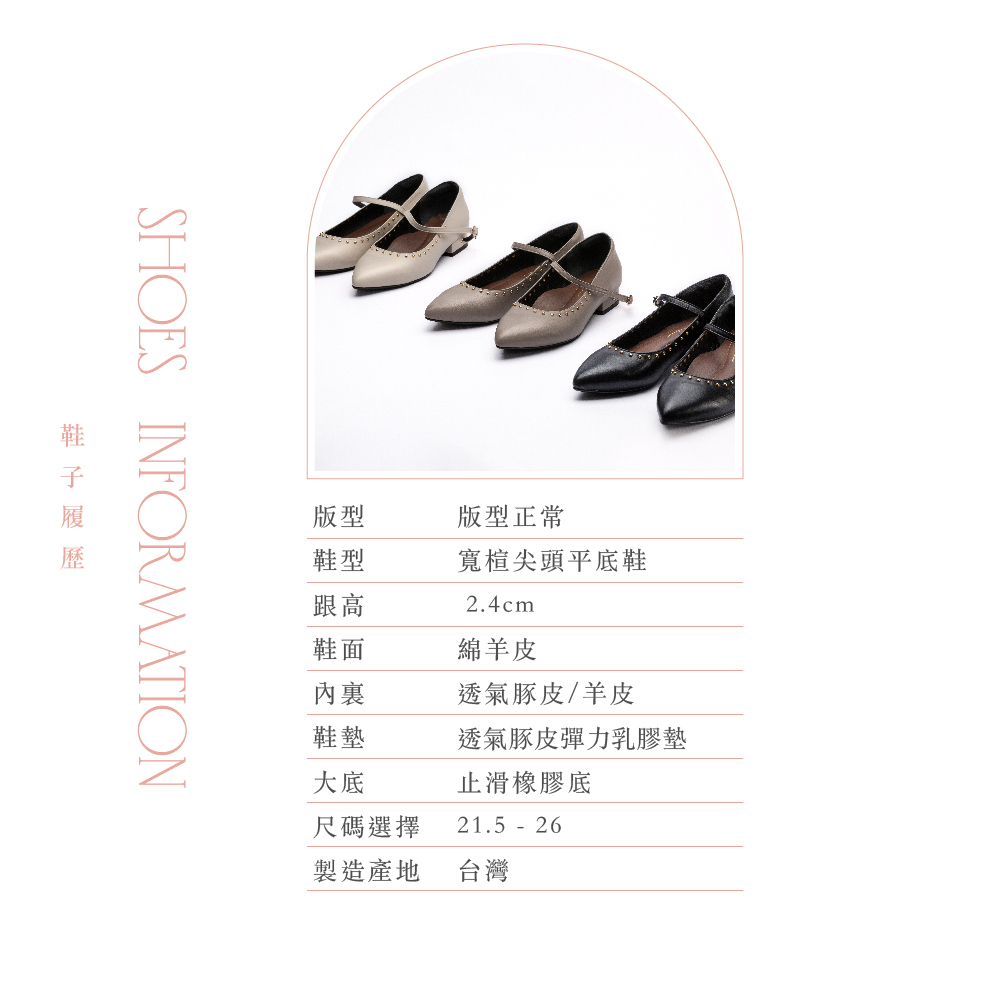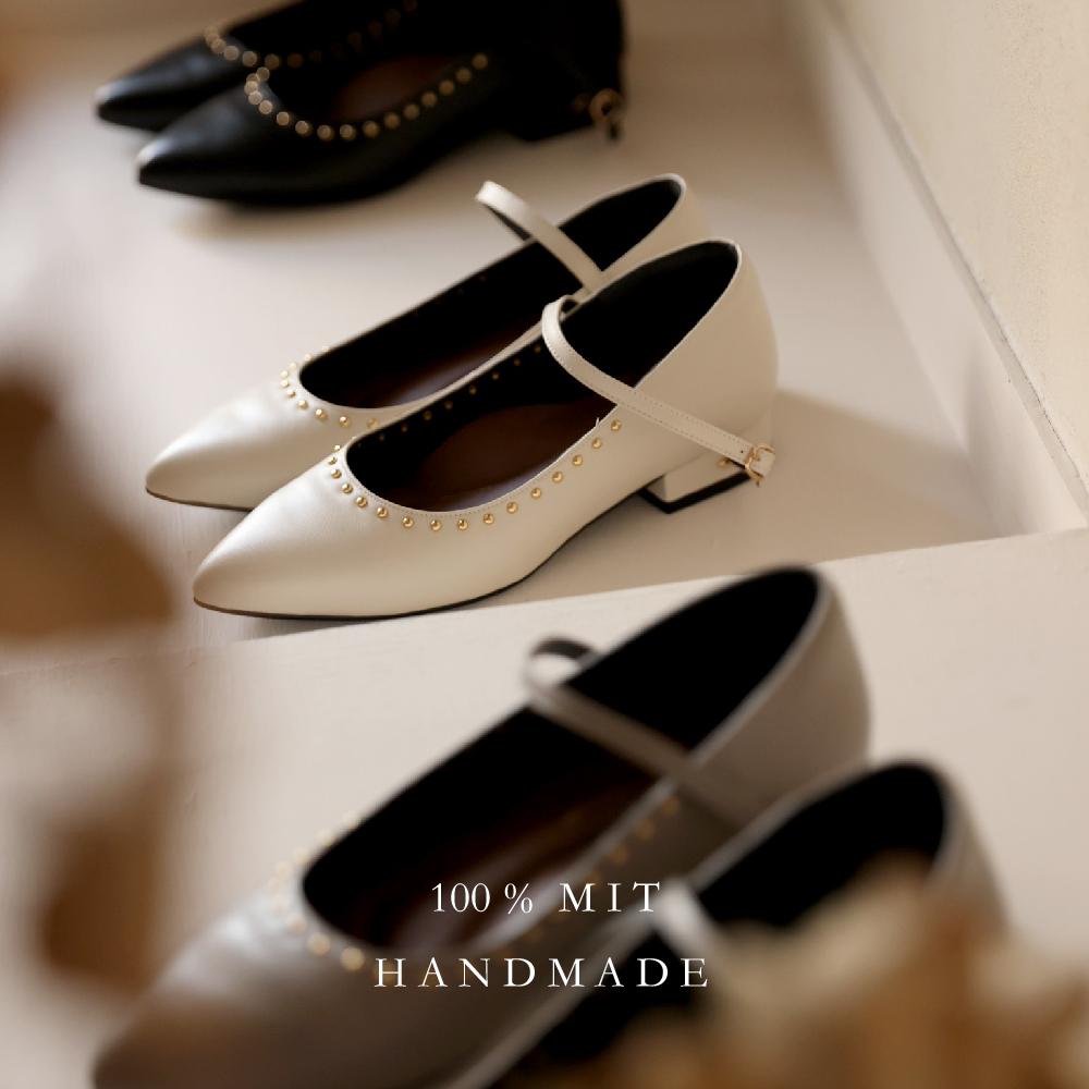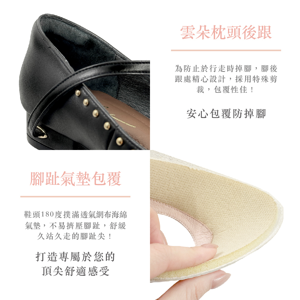 具有6mm真皮彈力氣墊,結合雲朵枕頭後跟和腳趾氣墊包覆。進口頂級特軟綿羊皮,由製鞋經驗30年的台灣老師傅手工揉整、縫製,手工打入鉚釘,特殊設計的鞋跟交錯繫帶,展現溫柔與力量並存的細節之美。