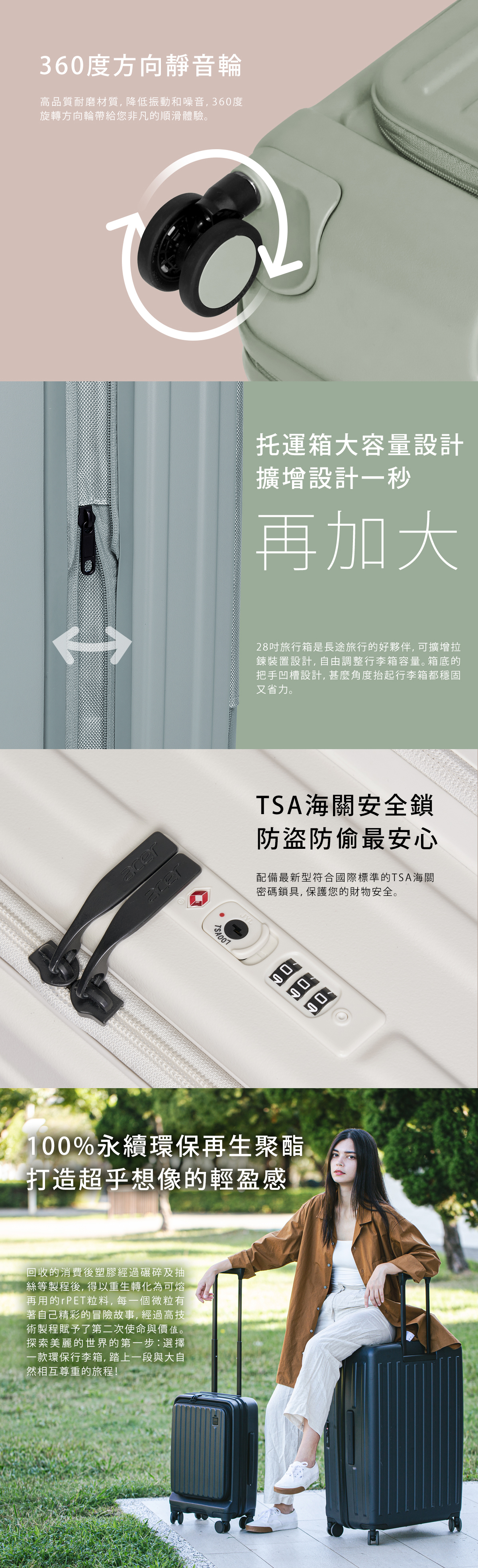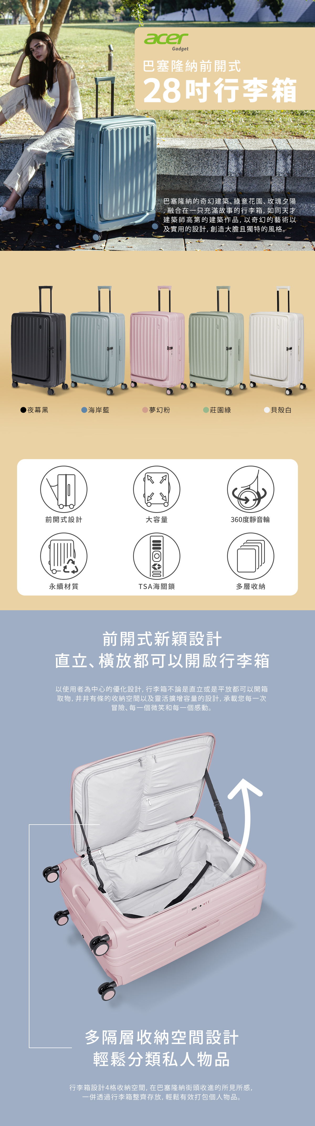 Acer 巴塞隆納前開式行李箱28吋大容量托運箱,前開式設計直立橫放皆可開啟,搭配4格分類收納與可擴增容量,整理更輕鬆。360度靜音萬向輪穩定好推,底部凹槽設計省力提取。採用100%環保再生聚酯打造,輕盈耐摔,配備TSA海關鎖,旅途更安心。