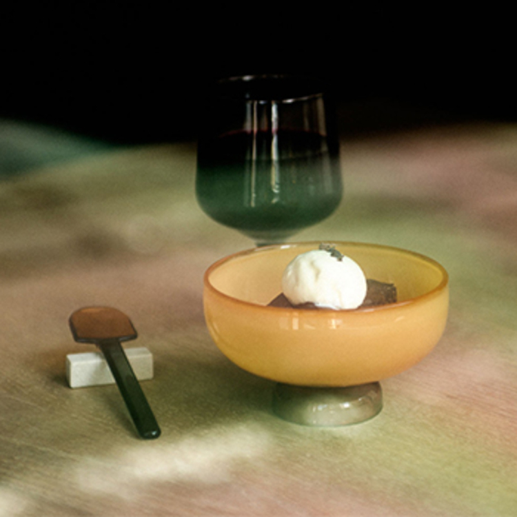 結合牛奶玻璃、透明玻璃碗邊緣以及溫潤配色的高腳底,創造出令人賞心悅目的點心碗。