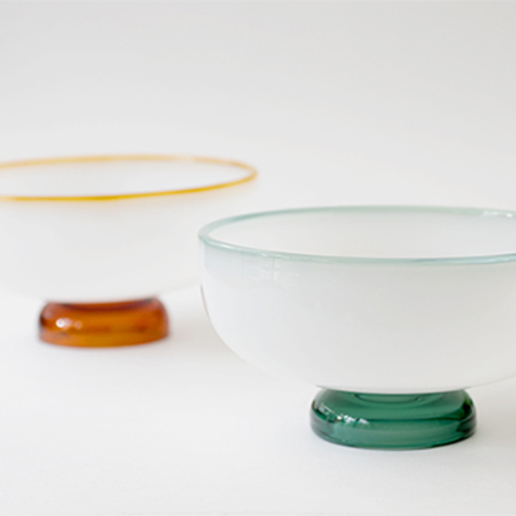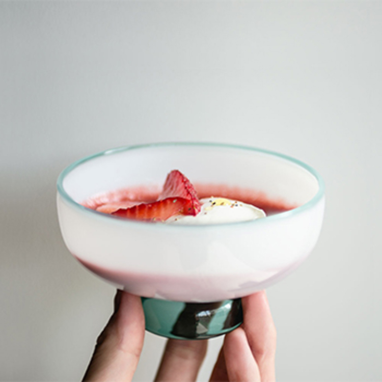 結合牛奶玻璃、透明玻璃碗邊緣以及溫潤配色的高腳底,創造出令人賞心悅目的點心碗。