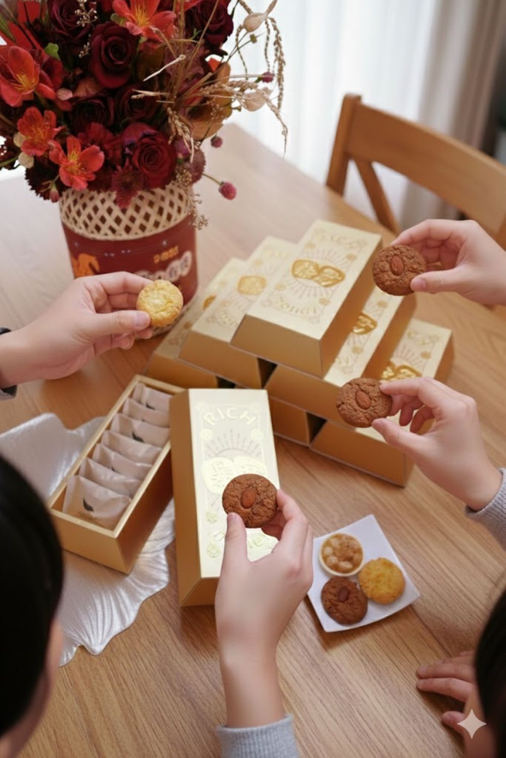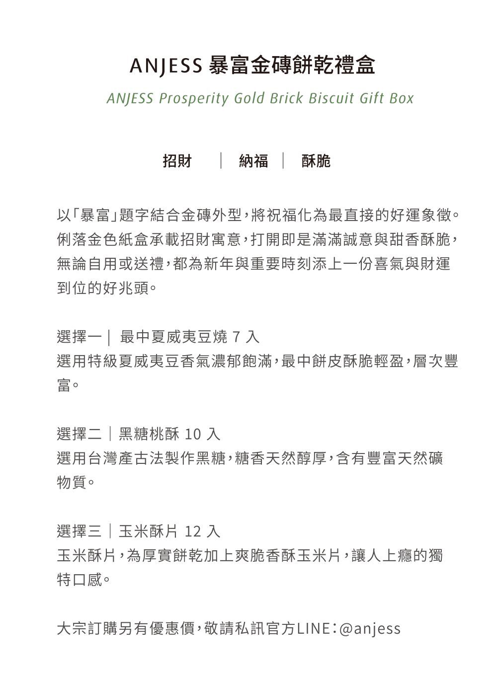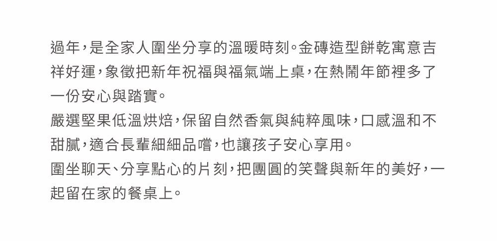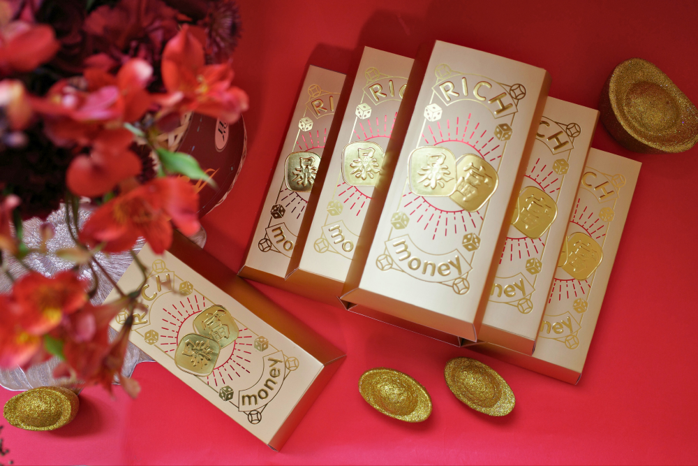 以「暴富」題字結合金磚外型,將祝福化為最直接的好運象徵。俐落金色紙盒承載招財寓意,打開即是滿滿誠意與甜香酥脆,無論自用或送禮,都為新年與重要時刻添上一份喜氣與財運到位的好兆頭。