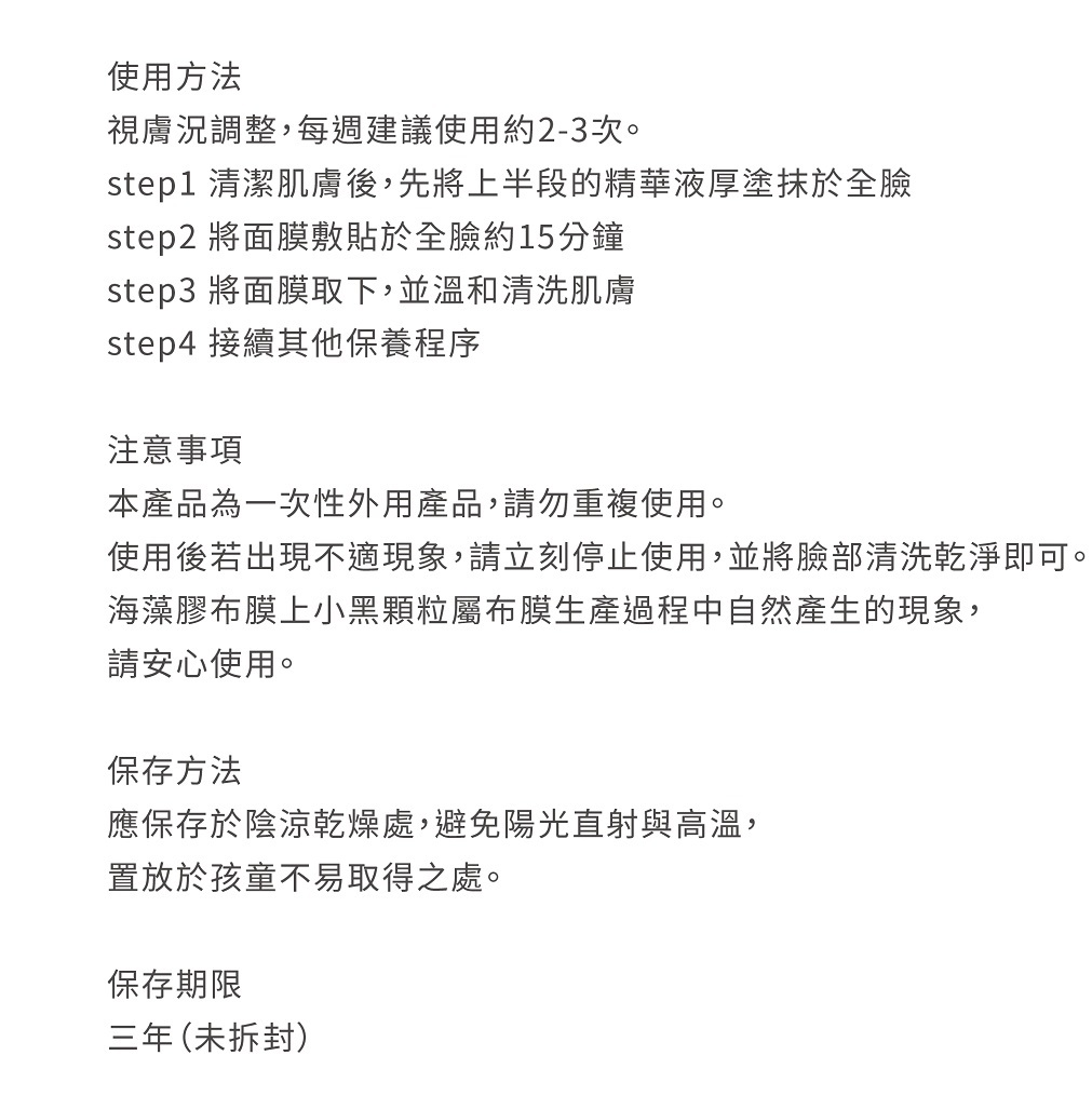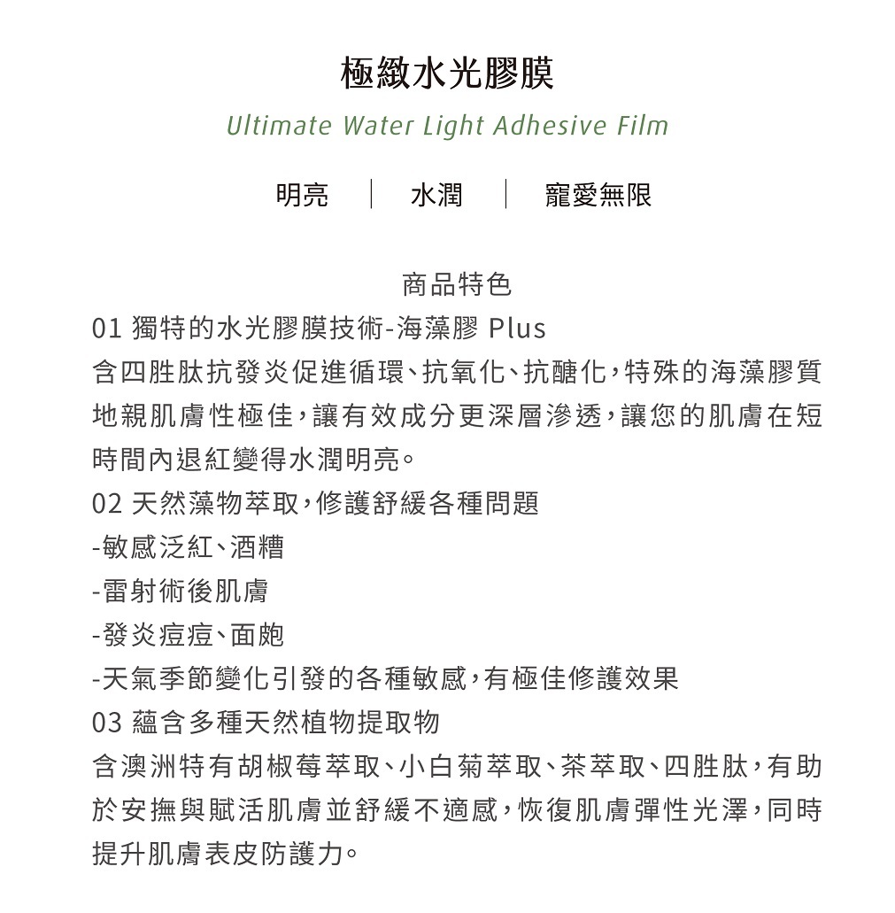 含四胜肽抗發炎促進循環、抗氧化、抗醣化,特殊的海藻膠質地親肌膚性極佳,讓有效成分更深層滲透,讓您的肌膚在短時間內退紅變得水潤明亮。