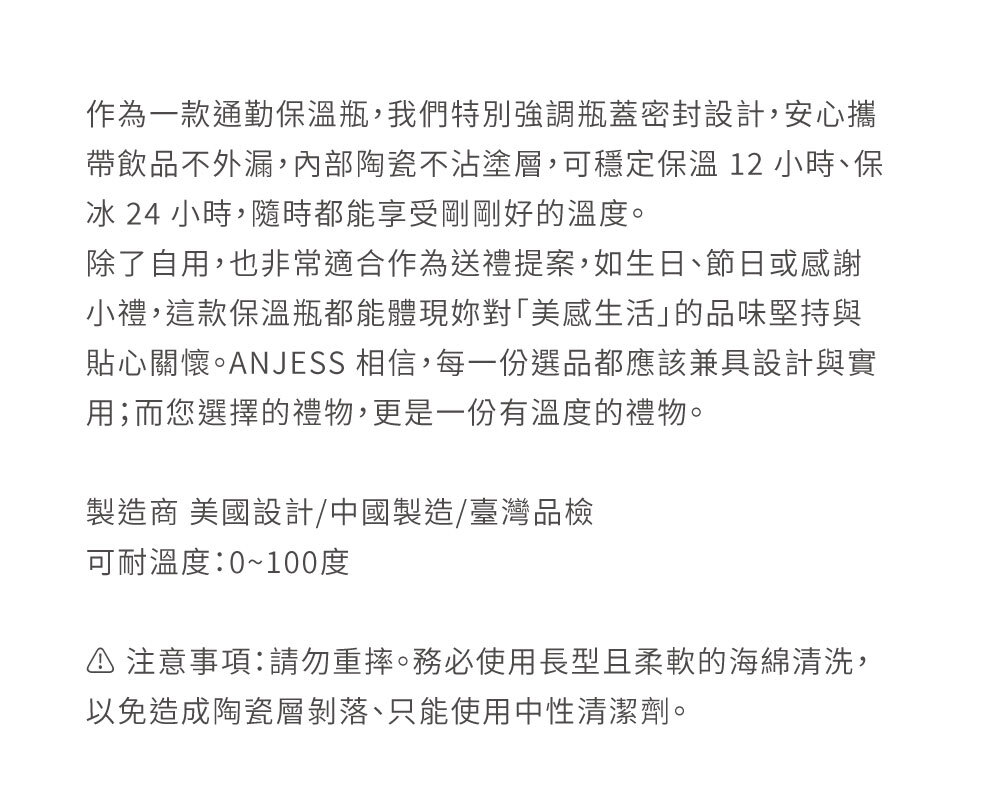 作為一款通勤保溫瓶,我們特別強調瓶蓋密封設計,安心攜帶飲品不外漏,內部陶瓷不沾塗層,可穩定保溫 12 小時、保冰 24 小時,隨時都能享受剛剛好的溫度。
