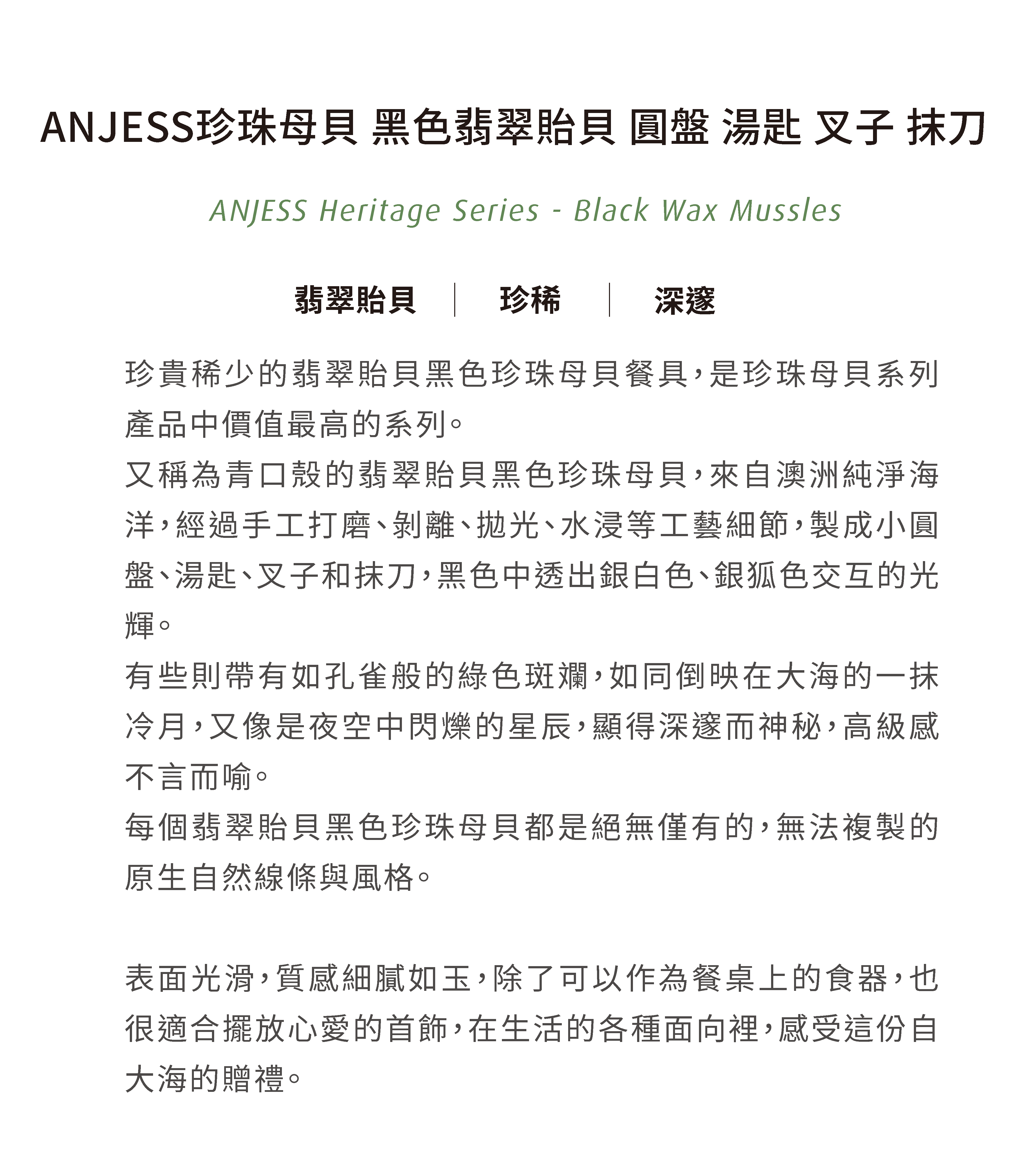 珍貴稀少的翡翠貽貝黑色珍珠母貝餐具是珍珠母貝系列產品中價值最高的系列,