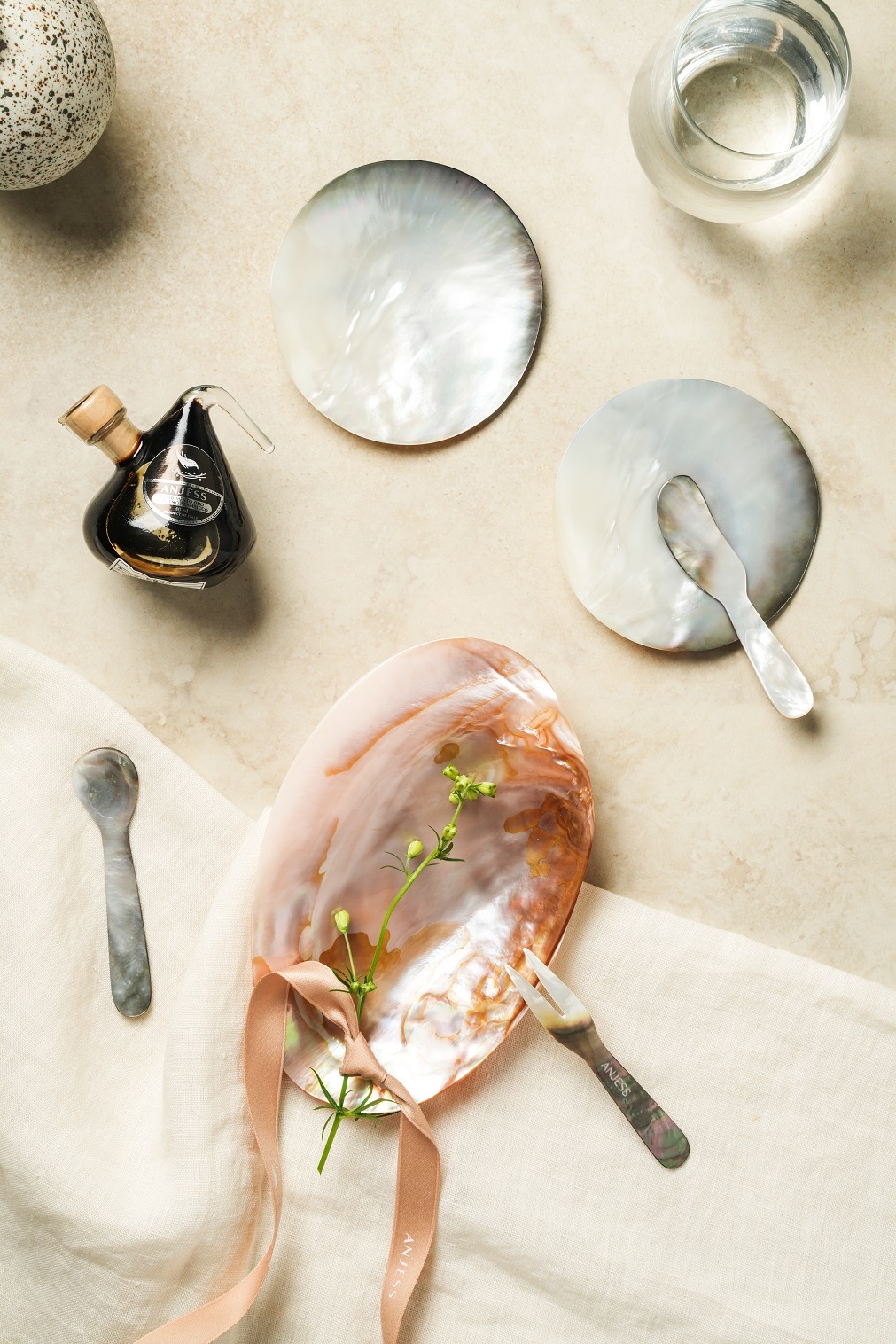 黑色中透出銀白色、銀狐色的光輝,顯得深邃而神秘,如同海中與夜空中閃爍的星辰,將澳洲純淨海洋的翡翠貽貝黑色母貝,經過手工打磨製成器皿。