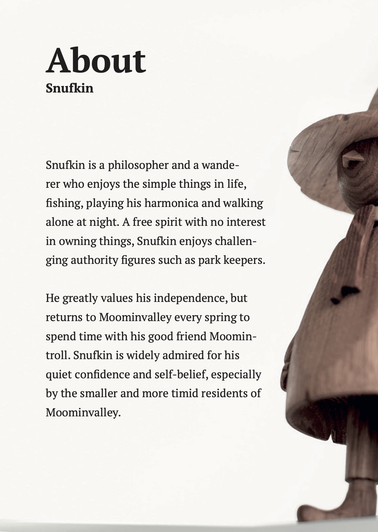 斯努夫金非常重視自己的獨立性,但每年春天,他都會返回姆明山谷(Moominvalley),與他的好朋友姆明妖精(Moomintroll)共度時光。他的沉穩自信和自我信念深受姆明山谷中那些較為膽小的居民們所欽佩。