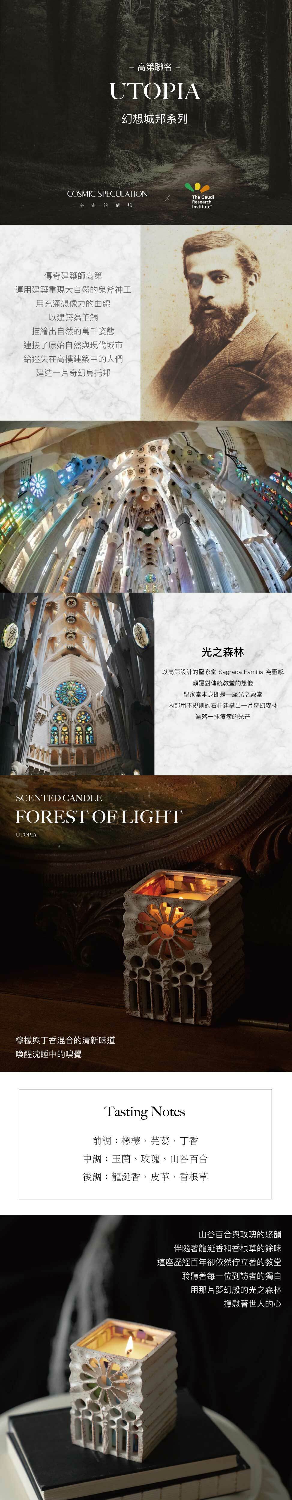 為致敬這位風格前衛的傳奇建築藝術家高迪,Cosmic Speculation宇宙的猜想攜手西班牙權威機構高迪研究院推出了Utopia幻想城邦系列香氛,以高迪的經典建築為靈感,用靈動的器皿盛滿自然愜意的香氣,創造出一個芬芳宇宙,一個高迪的幻想城邦,那裡矗立著自然之美凝結而成的奇幻建築,被最明媚絢爛的色彩所包裹著。給人帶來不同尋常的美和關乎自由的無限遐想,感知來自心靈深處最任性的張力,在視覺與嗅覺的雙重引領下,在這片Utopia稍作小憩;在吐納間,感受自然與城市的和諧氣息。