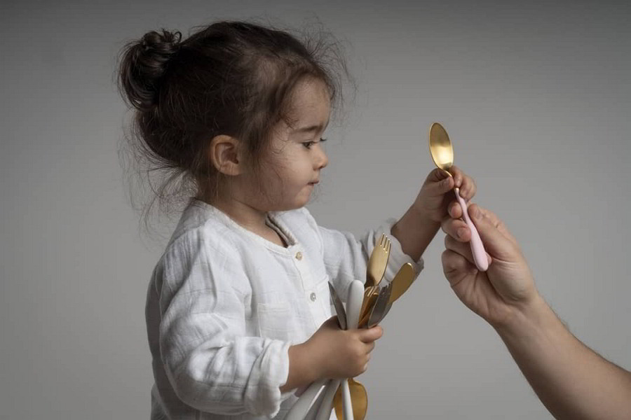 右手拿刀,左手握叉,讓小孩自己學著動手吃飯變得更容易!