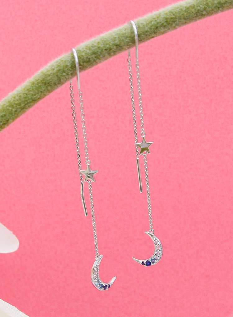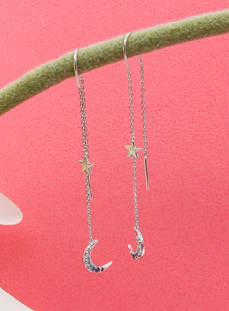 Dinner-星星月亮水晶銀長耳環