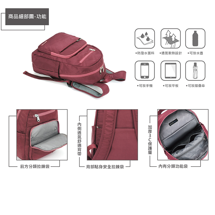 內功能袋-2;3C保護層-1;側邊水壺袋-2;後拉鍊收納袋-1