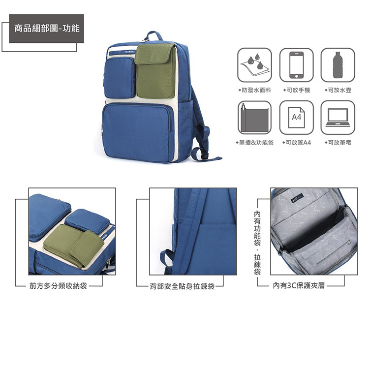 內拉鍊暗袋-1 ; 內功能袋-2;內筆插袋-1