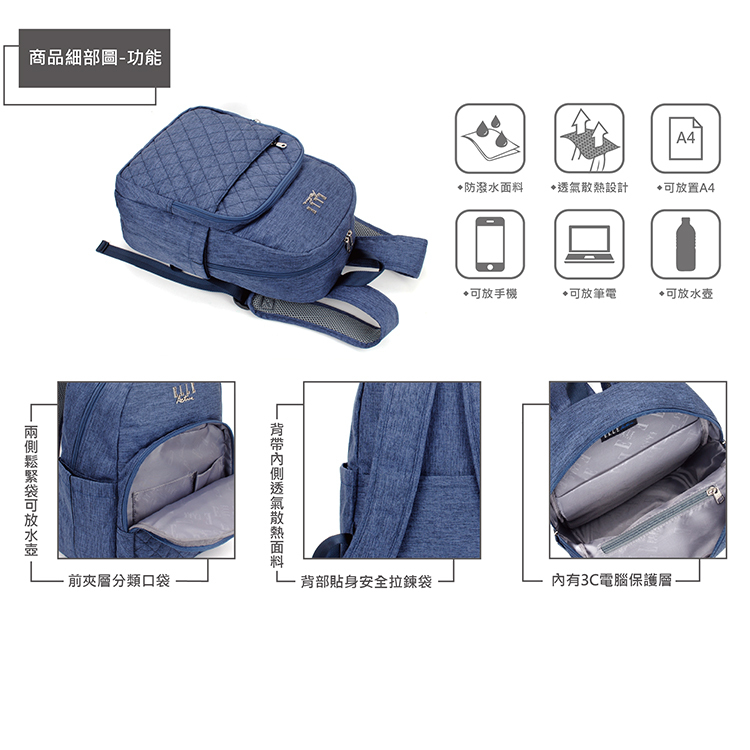 內拉鍊暗袋-1;3C保護層-1;側邊水壺袋-2;後拉鍊收納袋