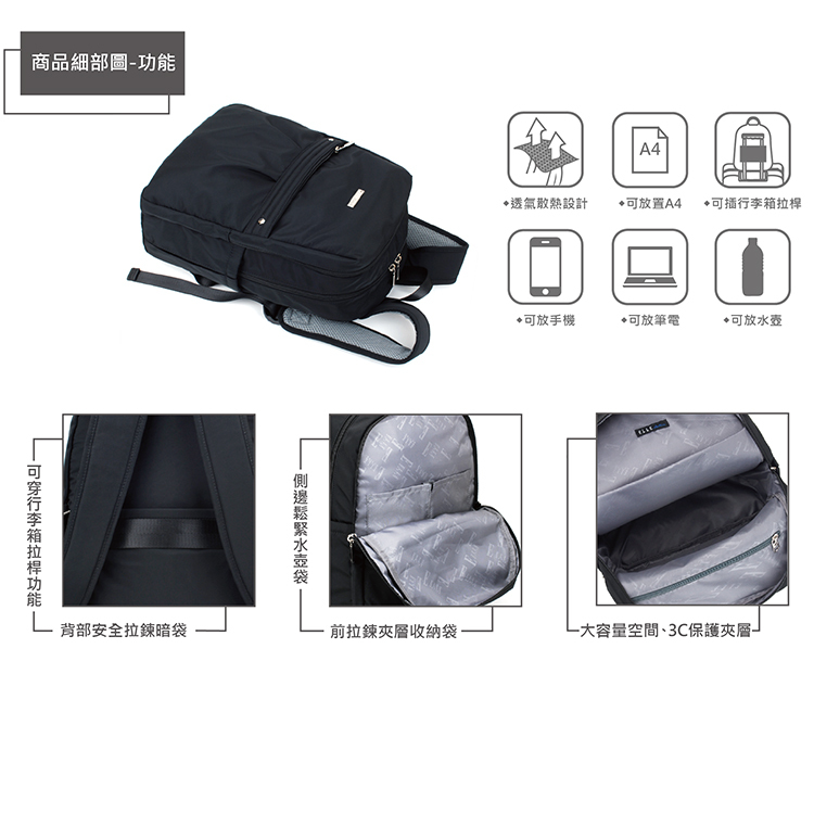 側邊水壺袋-2;後拉鍊收納袋-1;A4文件- 可