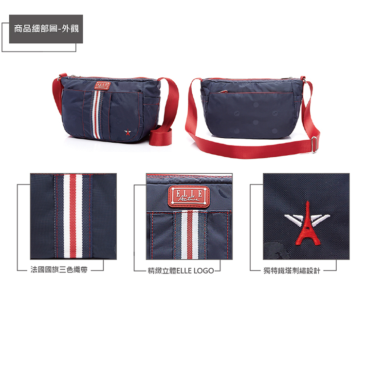 法蘭西象徵的藍白紅三色橫貫其中 , 是追求法式純粹所不可挑戰的信仰 , 可變的是經緯線穿插編織出三色的旋律 , 不變的是那法式獨有的氣韻 , 巧妙地將原本的雙翼鐵塔圖騰吊飾 , 化為典雅精緻的針線刺繡 , 經典復刻系列 , 再造ELLE ACTIVE的風華與雋永。