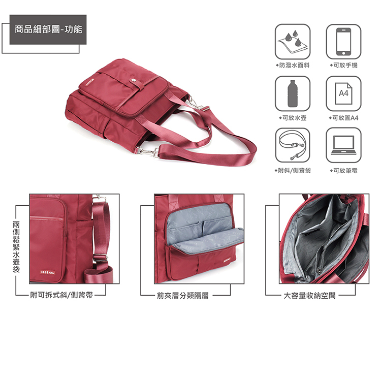 側邊水壺袋-2;後拉鍊收納袋-1;A4文件-可;可放筆電-可;附斜背帶
