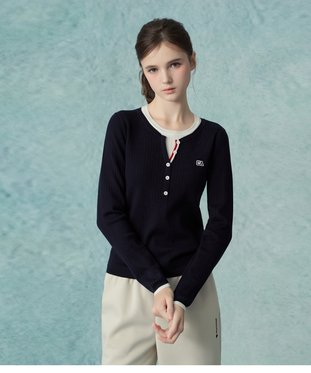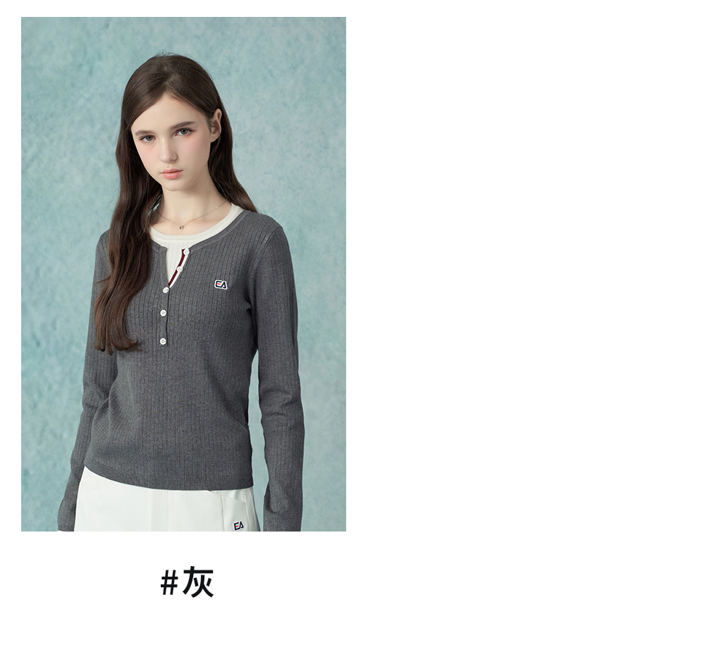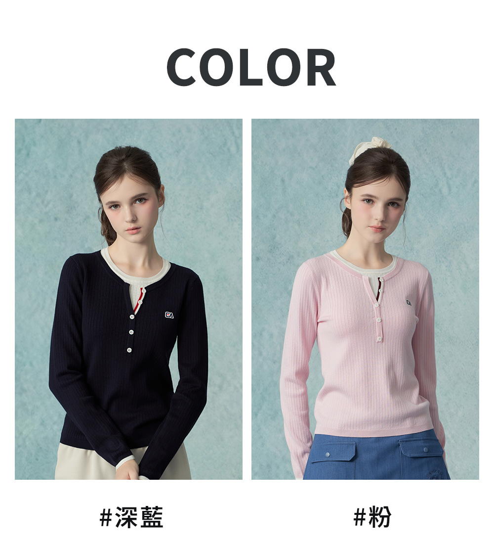 *假兩件針織衫通過領口不同顏色的撞色,營造出自然的 “疊穿效果”,V領位置的紅白藍設計,打造鮮明形象,彰顯品牌獨特品味。