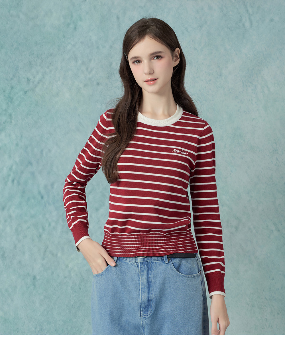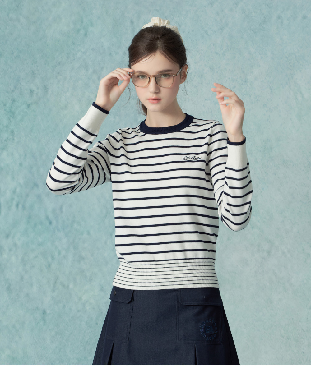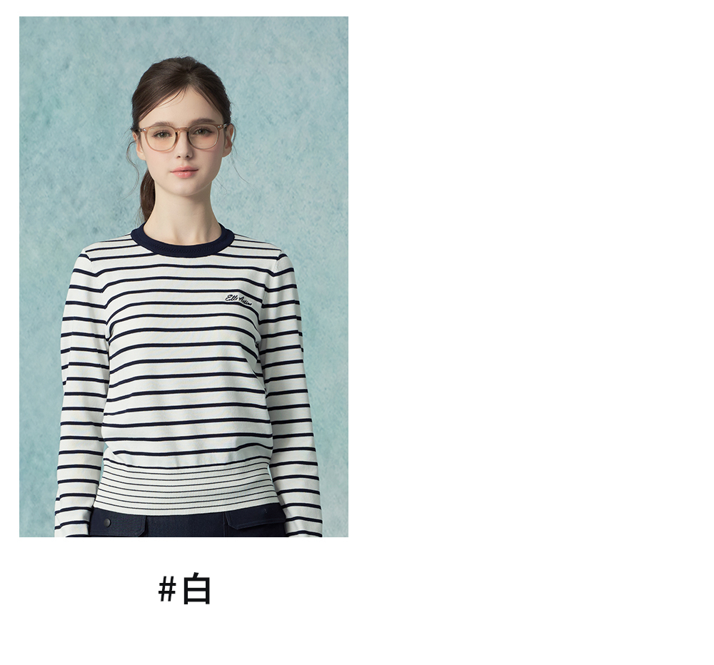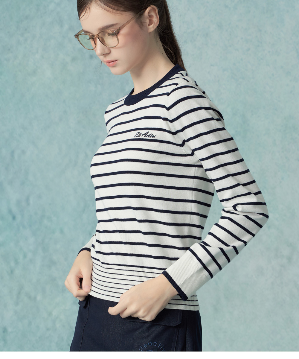 展現優雅與活力的條紋圓領針織長袖上衣,為您的時尚造型增添亮點。