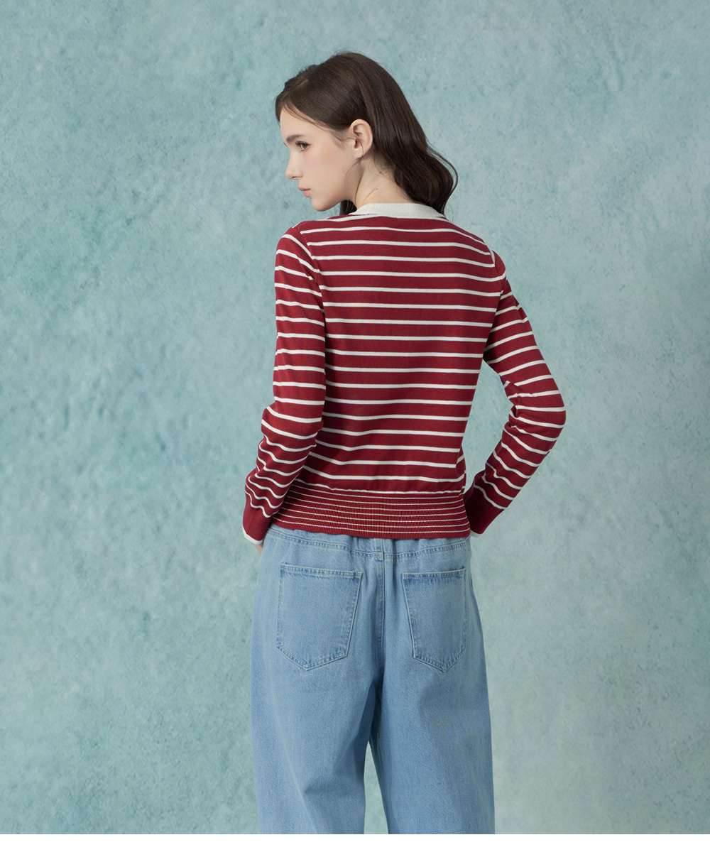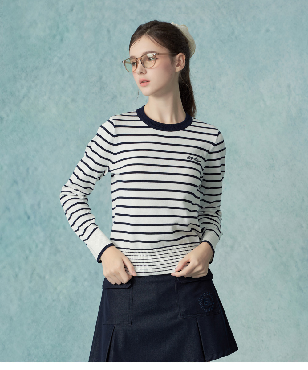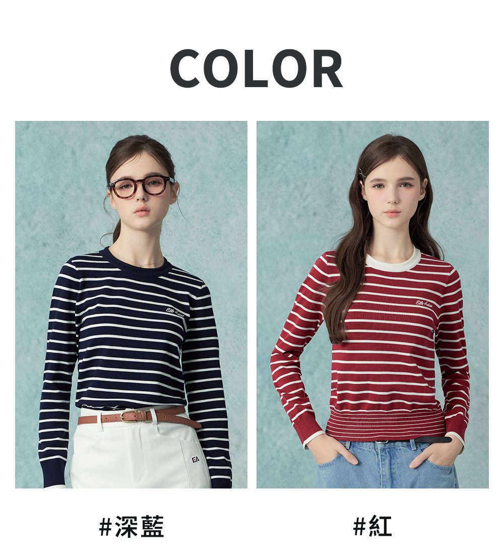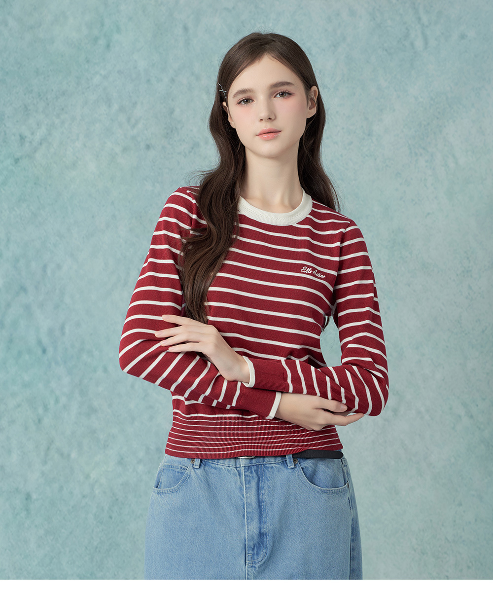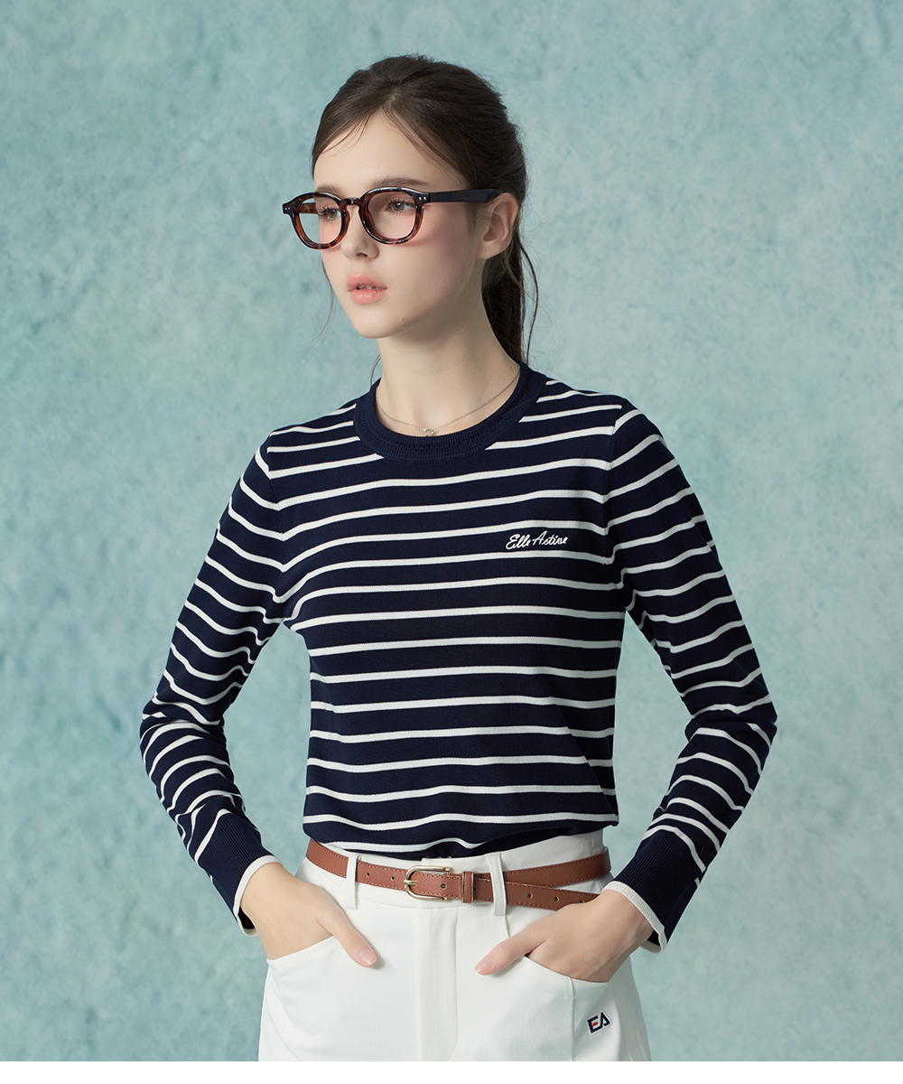 展現優雅與活力的條紋圓領針織長袖上衣,為您的時尚造型增添亮點。