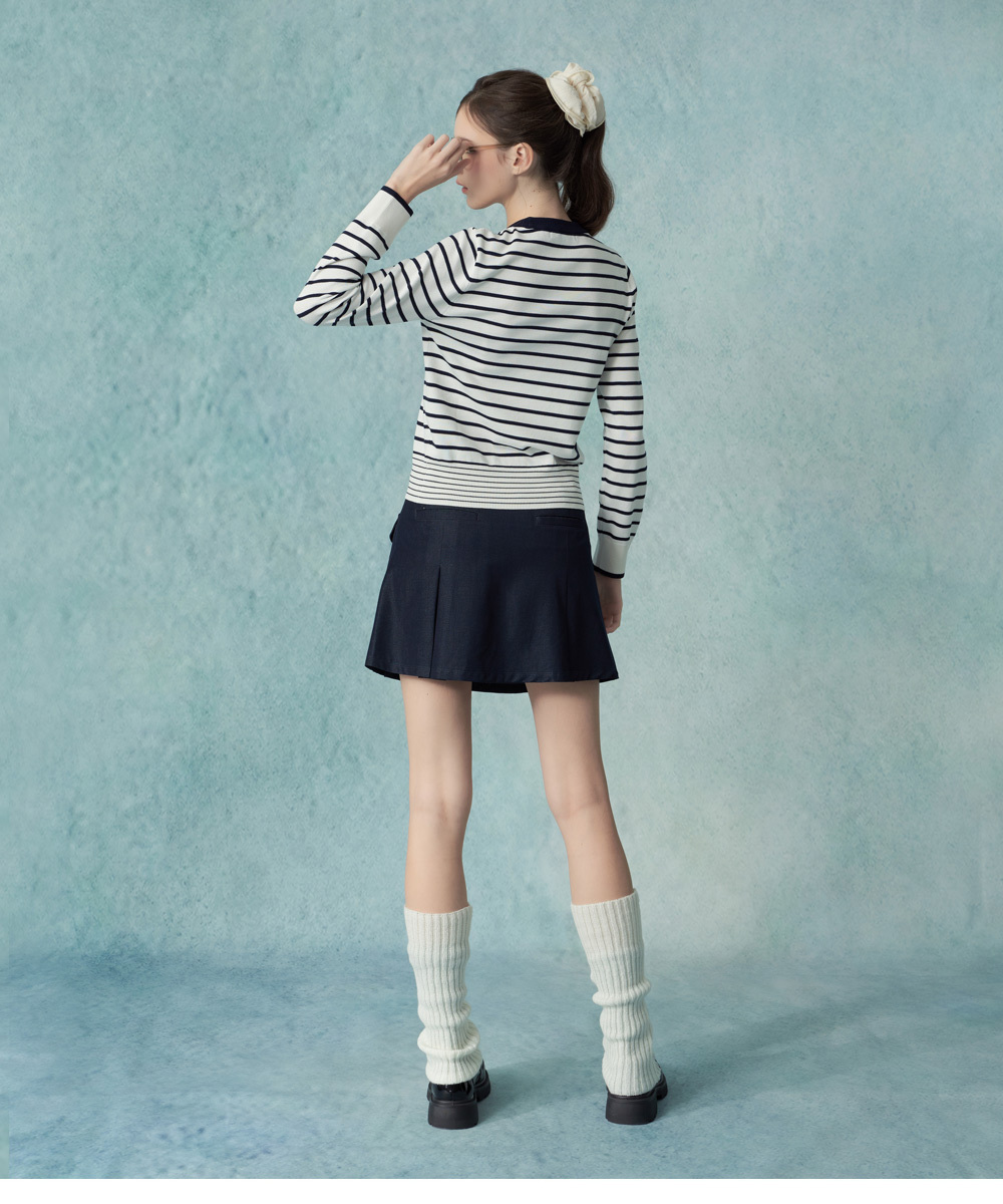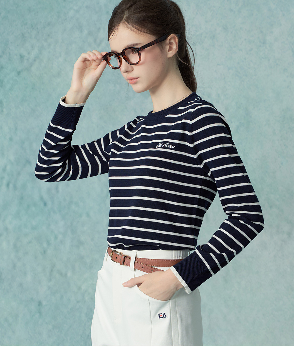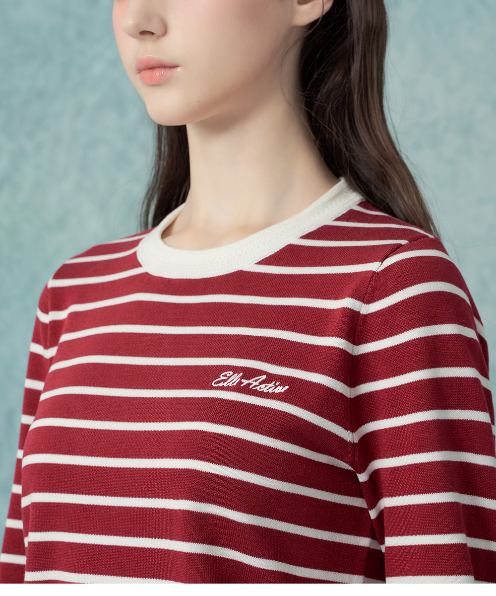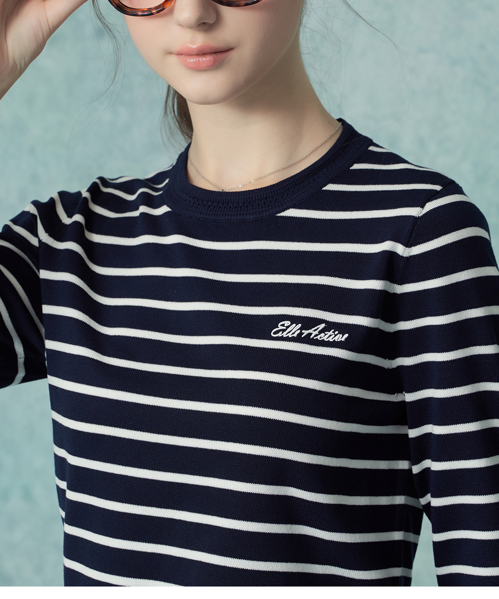 展現優雅與活力的條紋圓領針織長袖上衣,為您的時尚造型增添亮點。