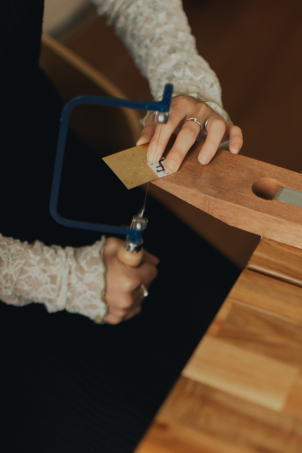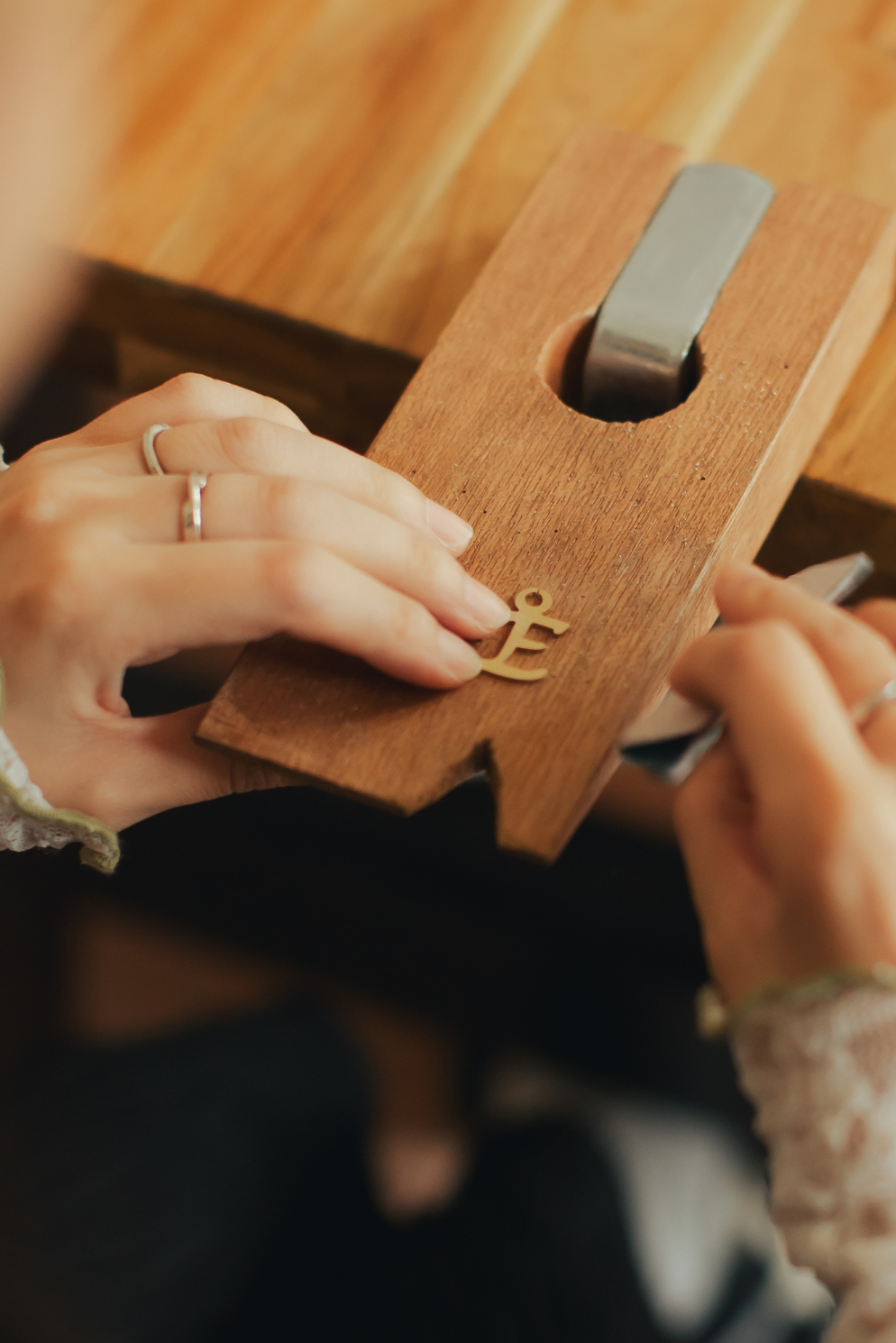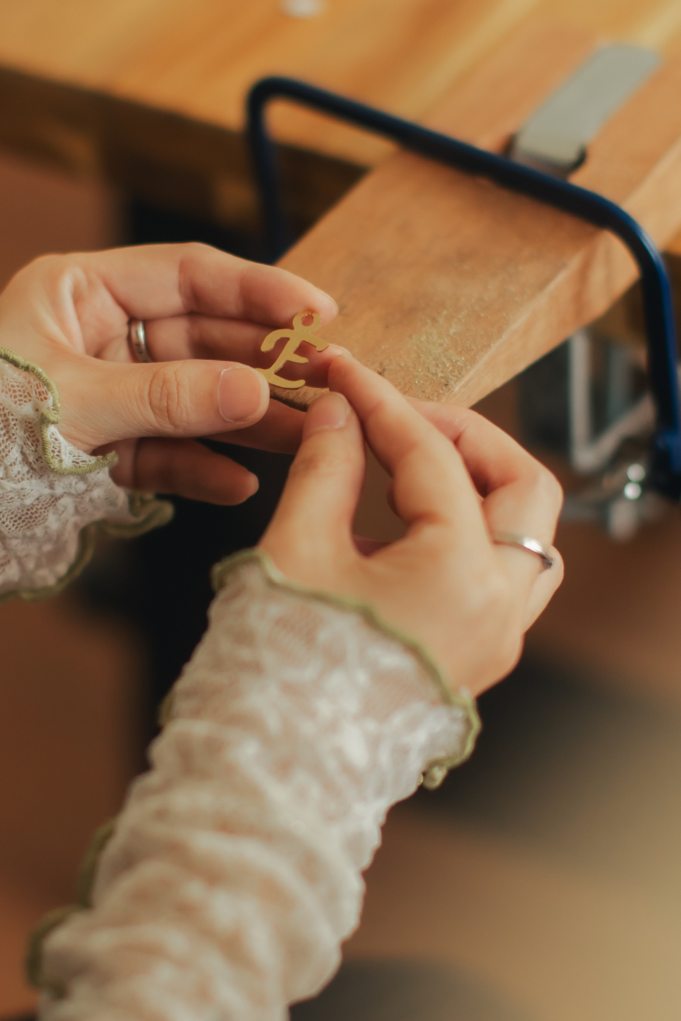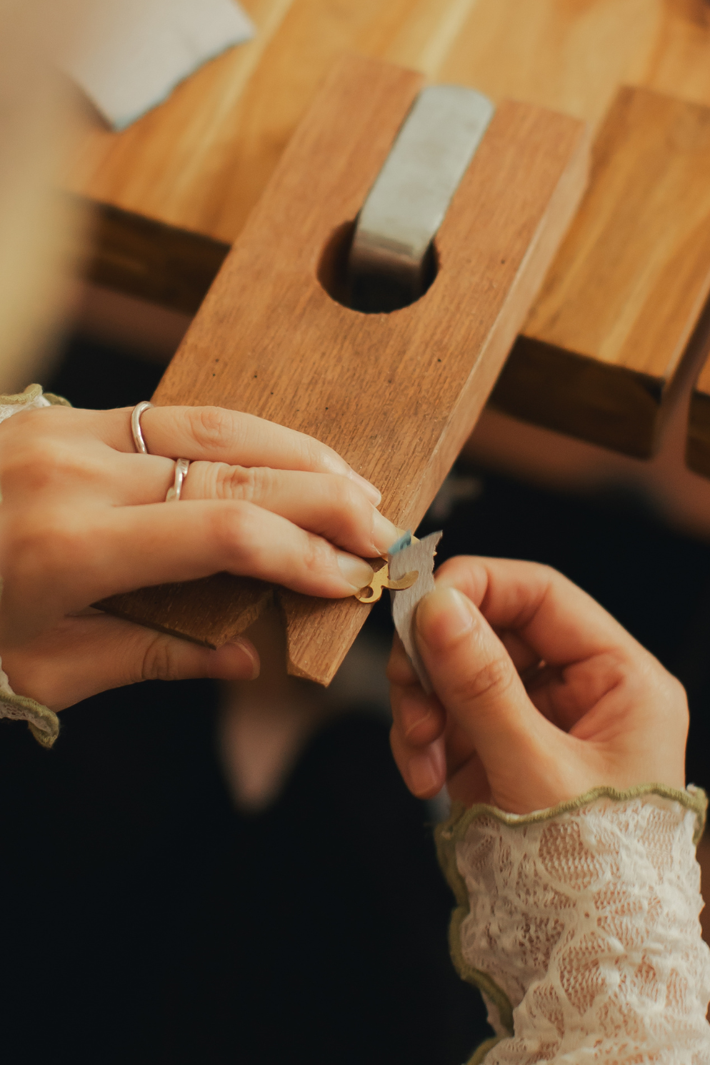 選用各種金屬媒材,透過鋸切、焊接、銼修、研磨等不同的技法,過程中藉著雙手與火焰的升溫,掌控並觀察每處細節,重現植物的有機型態,將冰冷生硬的金屬轉化成溫潤細緻的飾品。