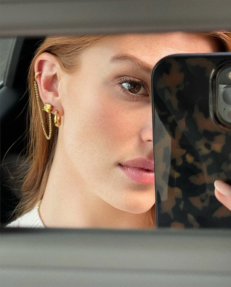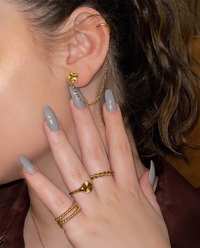Ellie Vail 飾品由鍍有18K金的不銹鋼防過敏金屬製成,可以碰水清潔,可以配戴洗澡。 生鏽、腐蝕、皮膚刺激主要是由飾品內層的金屬導致。Ellie Vail使用的飾品金屬材質不會腐蝕、生鏽或刺激皮膚。 仍需要避免接觸乳液、保養品及香水等化學物質,以維持飾品亮度及光澤