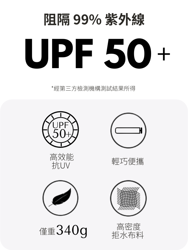 ‧ 最高級抗UV UPF 50+,阻抗99%↑紫外線