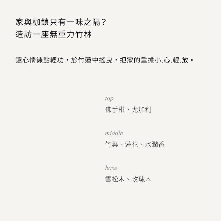 在家讓心情練點輕功,於竹、蓮中乘風搖曳,把生活重擔小.心.輕.放。如同你想像中的竹林,層次繚繞,引人想入深處一探究竹葉和蓮花神秘芬芳。若使用在客廳或公共區域,可展現家中主人臥虎藏龍的個性。HiOO以想像力打開可能性的居家香氛品牌,致需要空呼吸的人們,好好換氣。