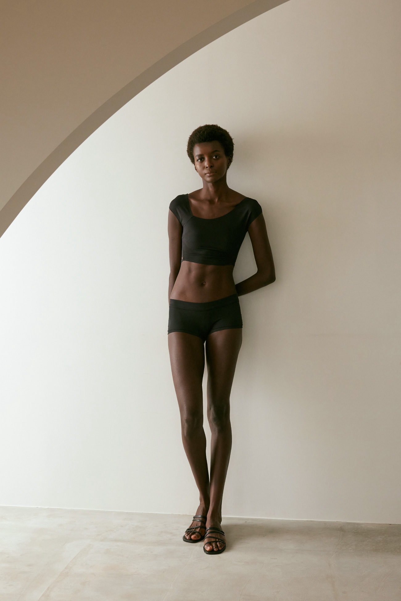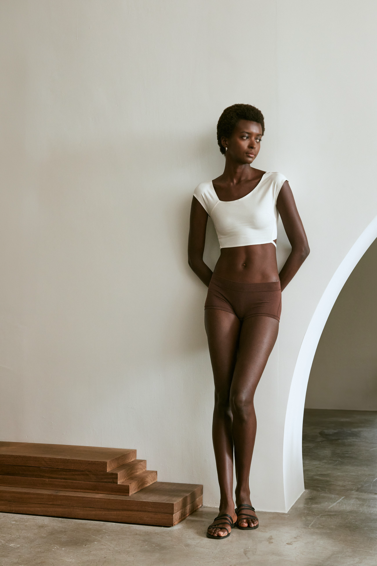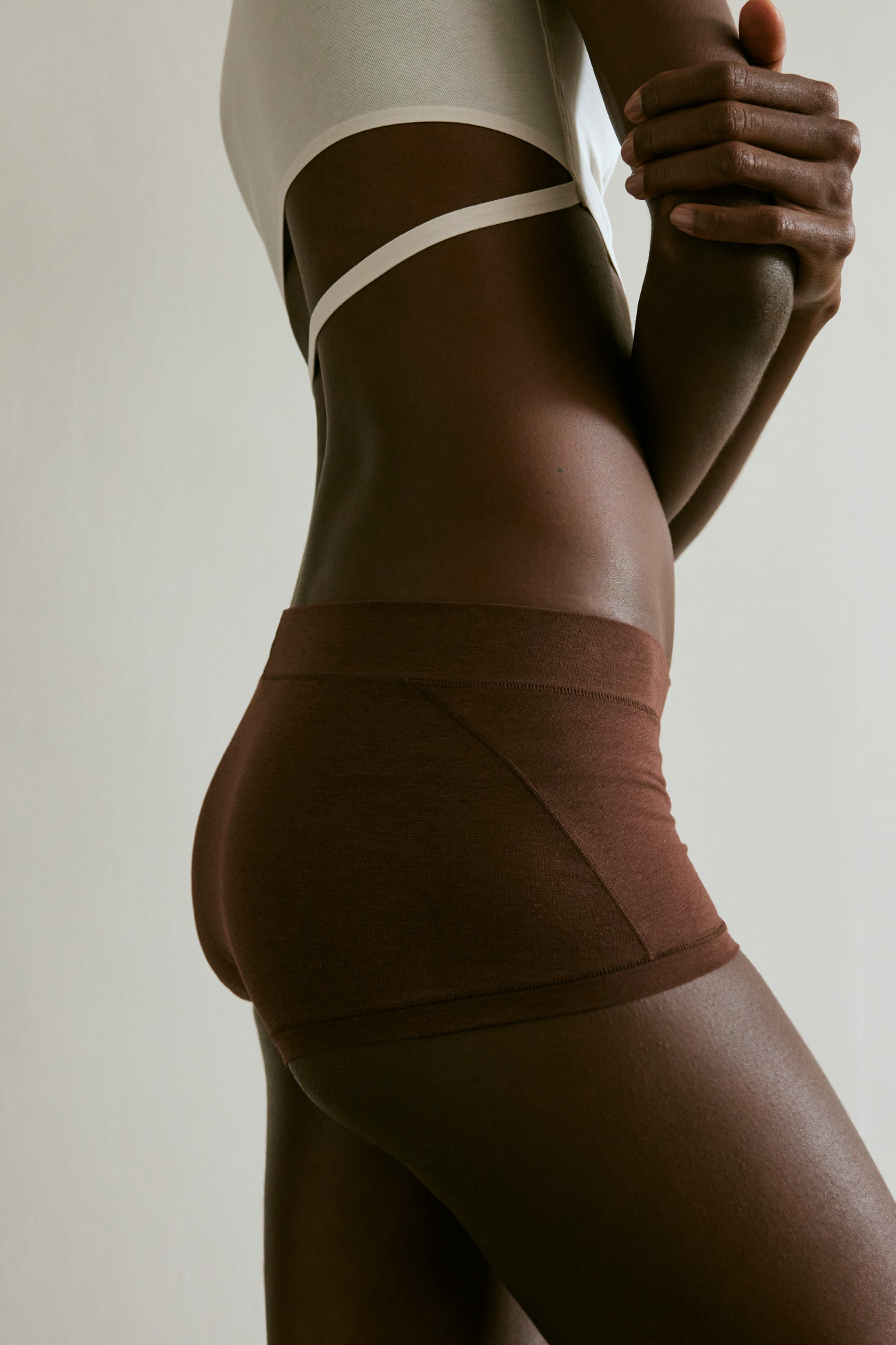 中低腰圍的平口四角設計帶來安心與舒適感,兼具內褲、居家褲和安全褲的功能。側邊弧形剪裁並以魚骨車縫技術取代一般車線,打造舒適零著感。