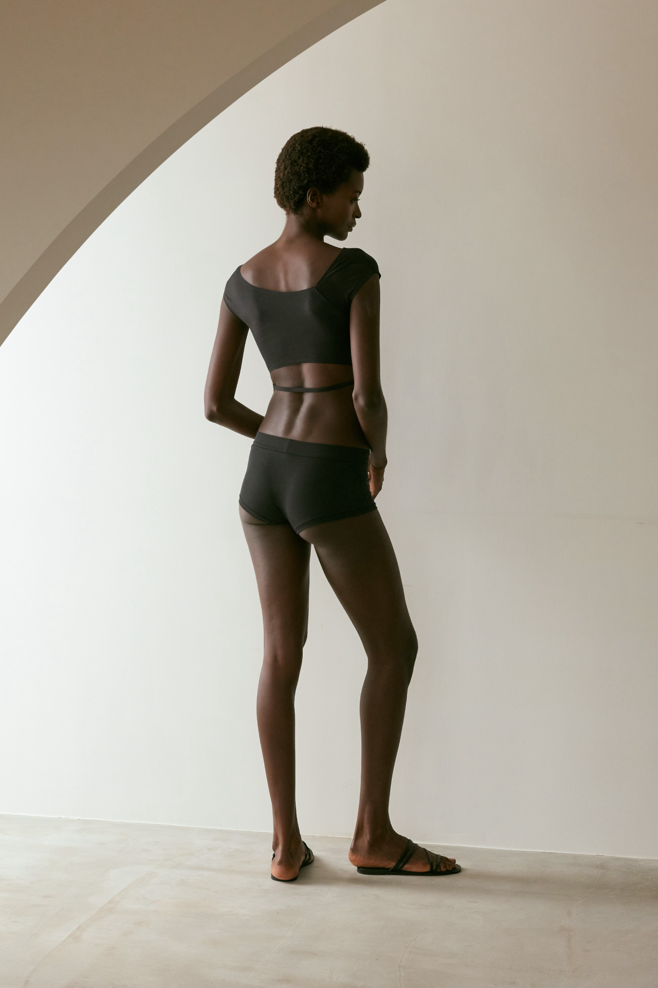 • 彈性內襯腰頭取代傳統的鬆緊帶,輕柔包覆腰部肌膚,Y字不摩擦。