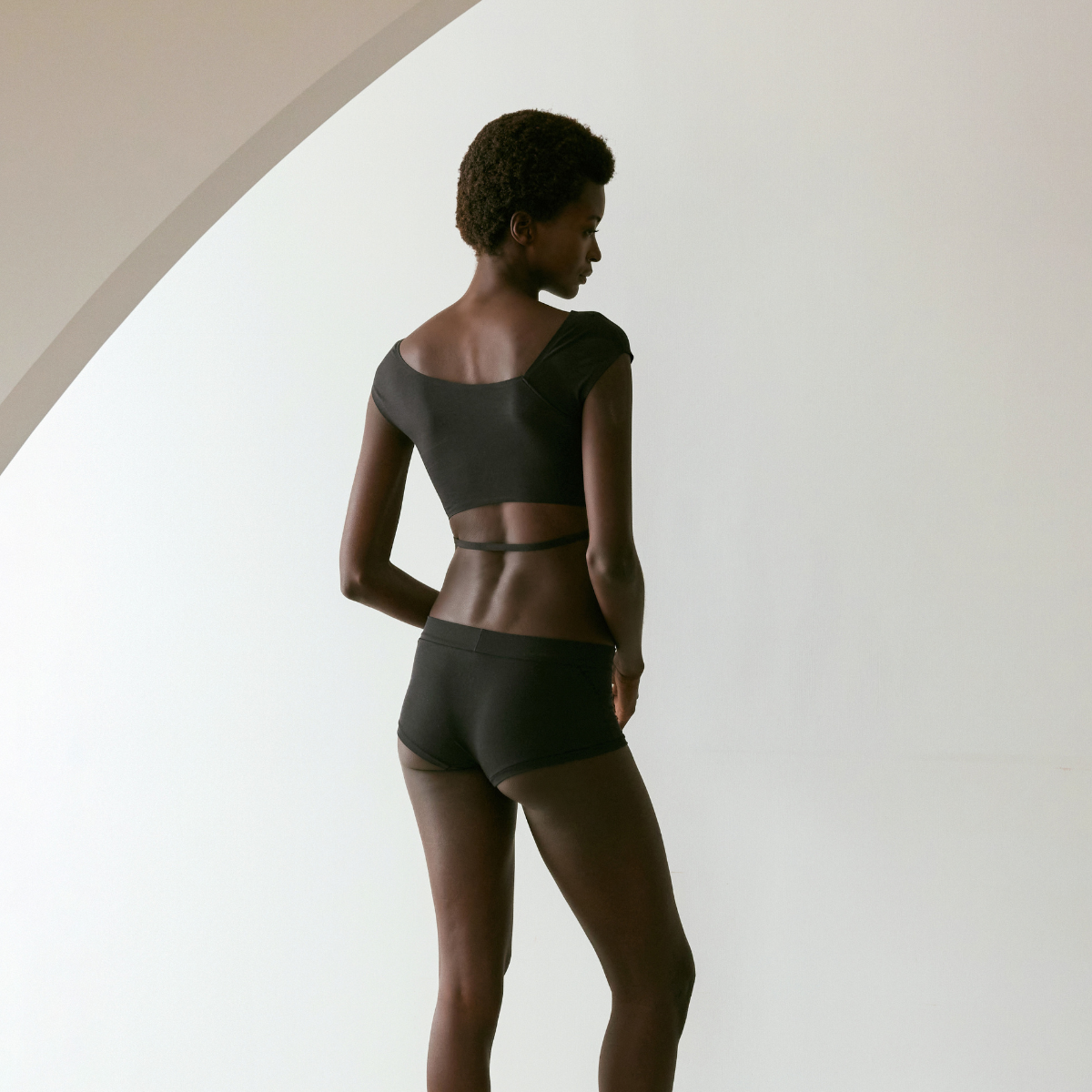 TENCEL™ Modal混紡蠶絲提供柔軟的垂墜感給予舒適且親膚的高包覆性。中低腰圍的平口四角設計帶來安心與舒適感,並讓用途更多元。