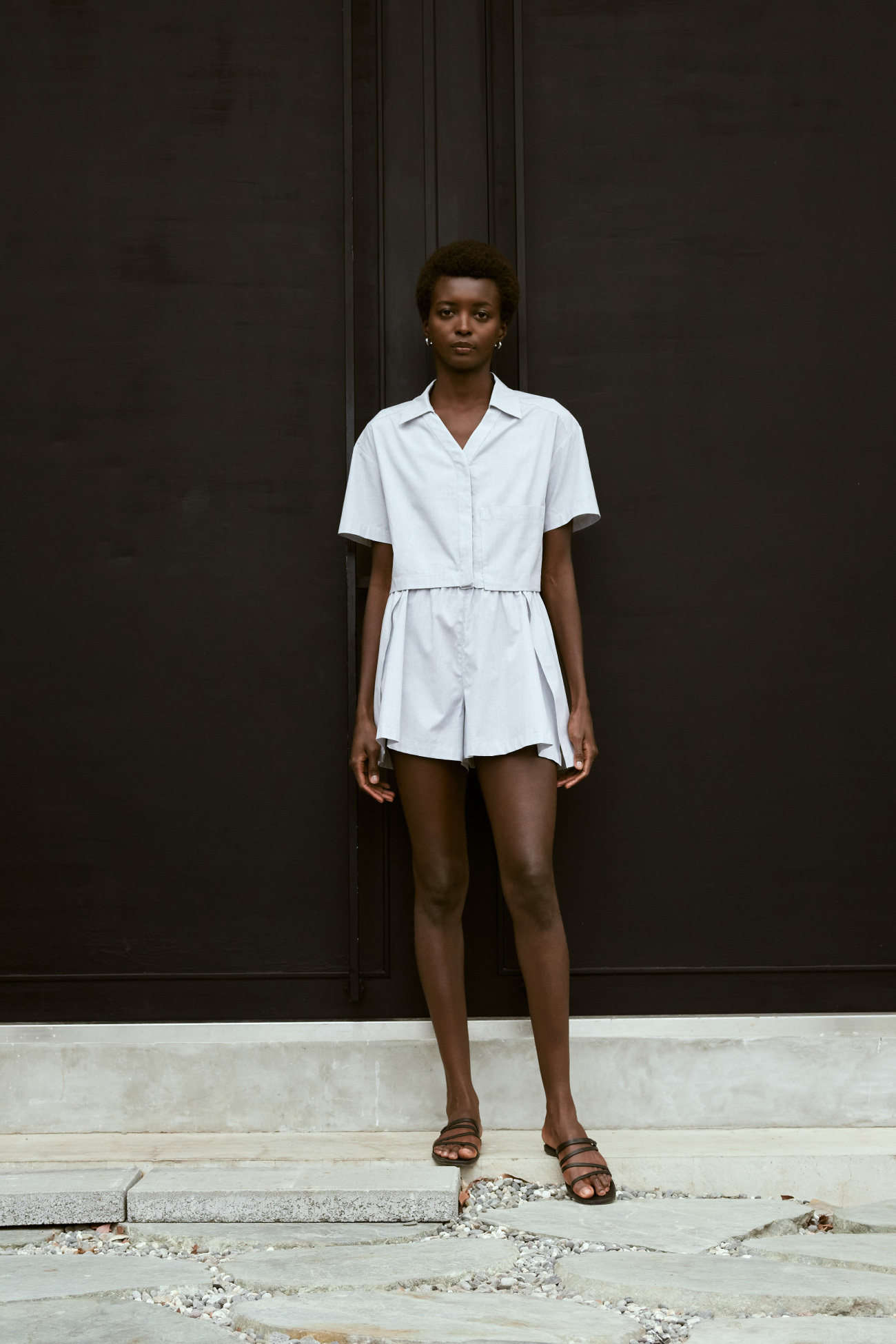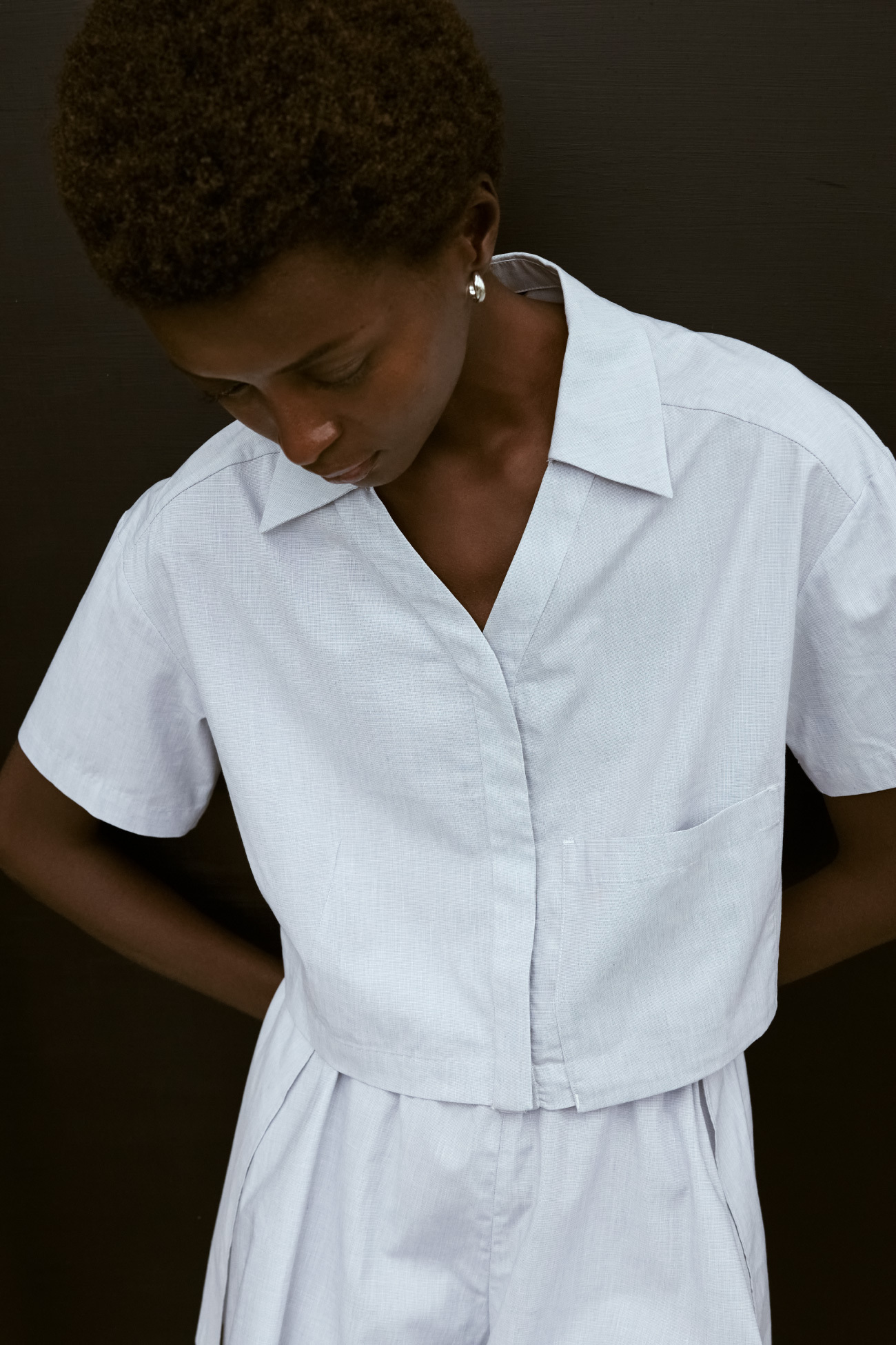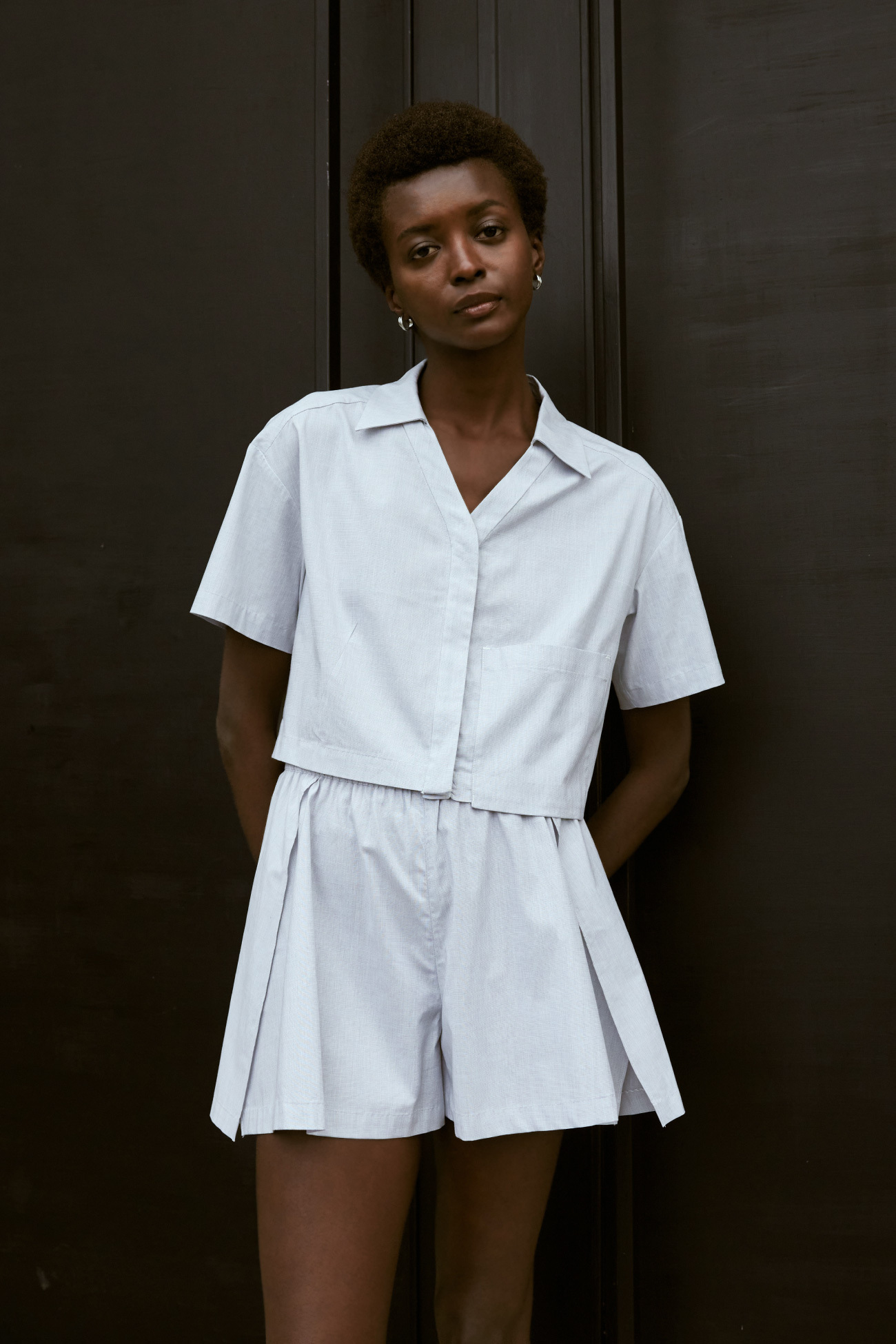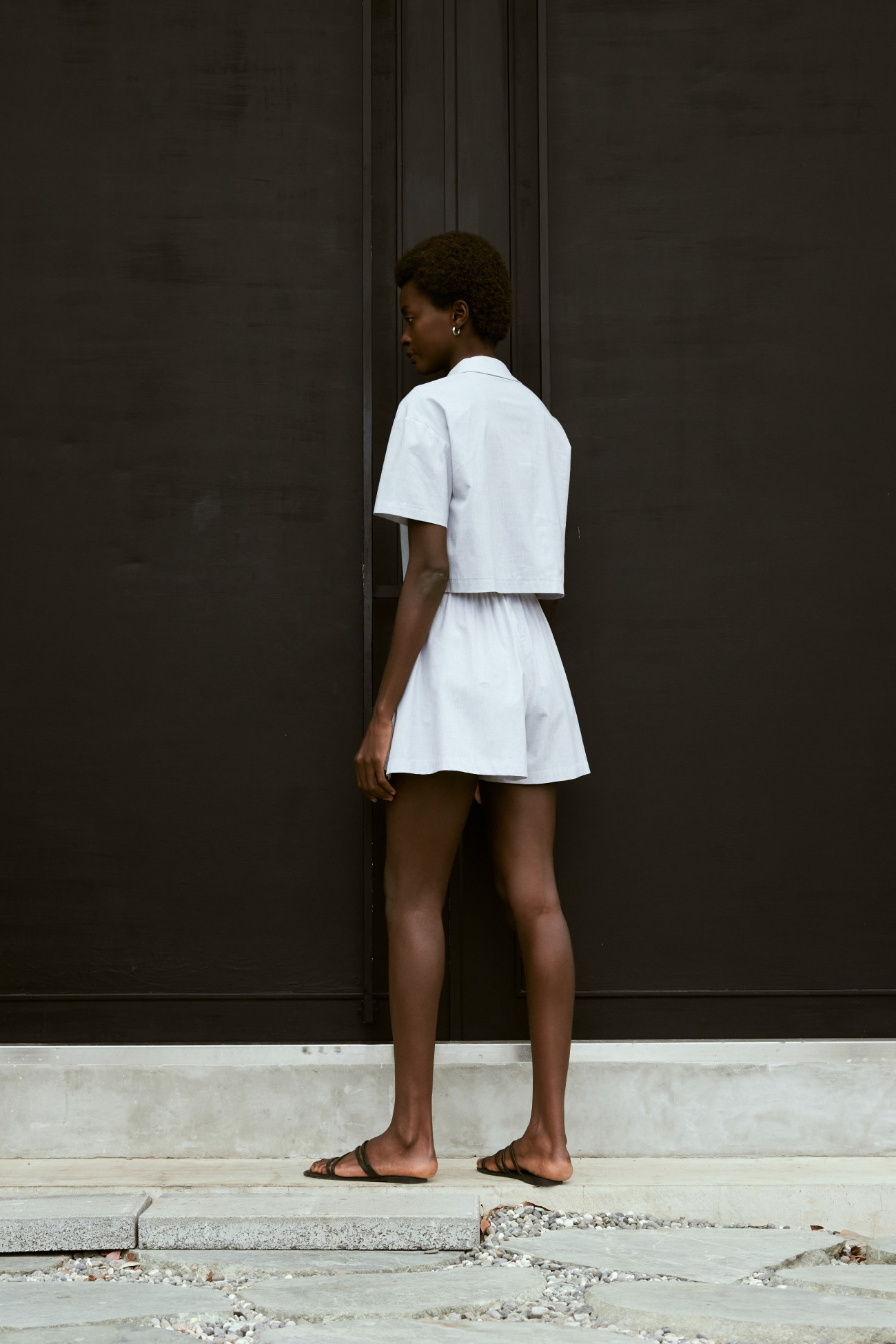 開領落肩搭配寬鬆輪廓的短版襯衫,可單穿或外罩,展現休閒氛圍的簡約風格,成套搭配同系列褲裙,輕鬆展現舒適自在。