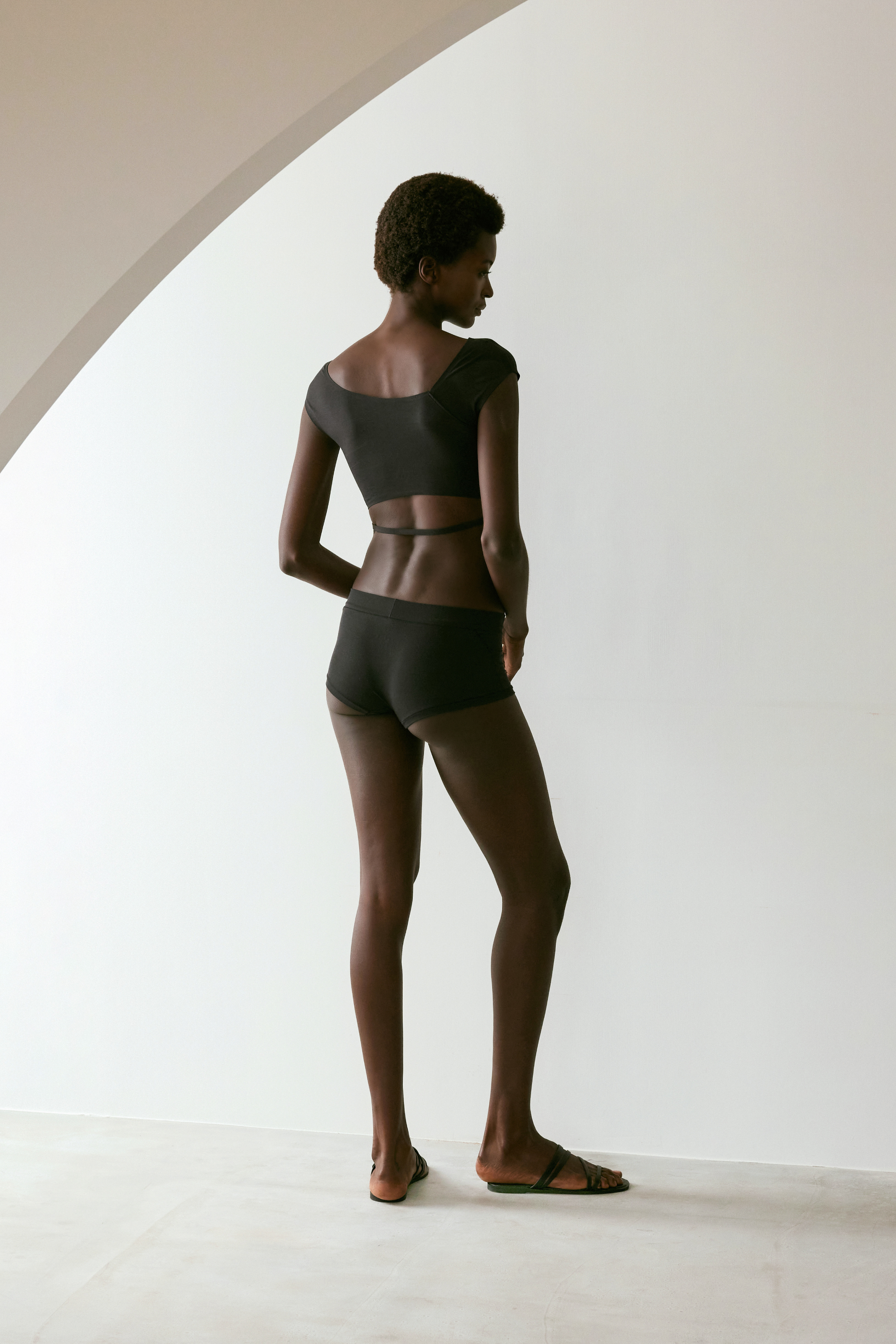 採用細緻精梳棉面料,雷切黏合收邊工藝,搭配斜領連袖的短版設計,輕鬆打造舒適的俐落感。有機棉具有良好的透氣性,讓您感受到全天候的舒適感。斜領連袖的短版設計與後腰裝飾細節,增添穿搭巧思。