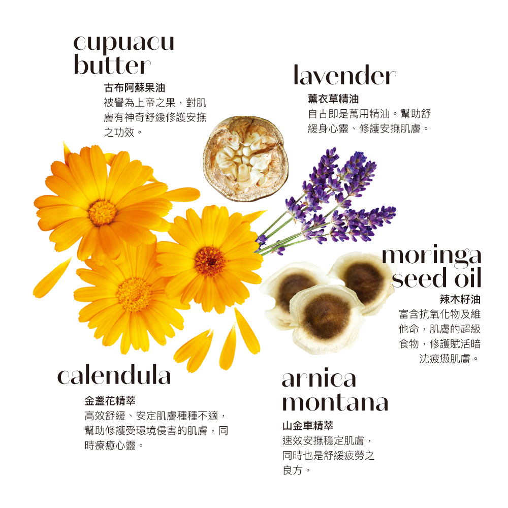 金盞花-舒緩、鎮靜和抗炎,幫助修護受環境侵害的肌膚,同時療癒心靈。