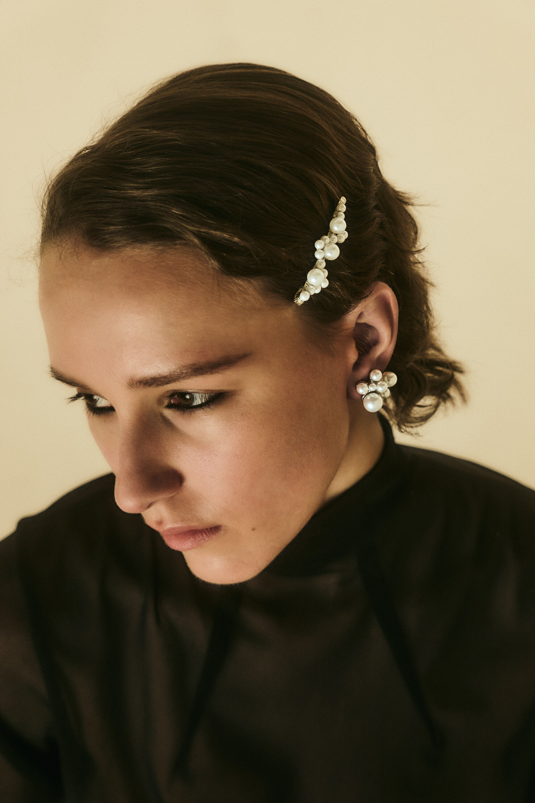 以大小不一的珍珠勾勒出自然流暢的曲線,優雅點綴臉龐周圍。