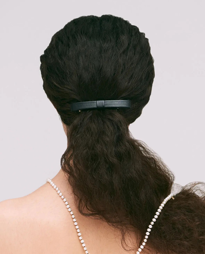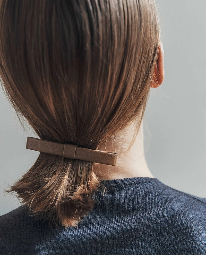 猶如被綁緊的細緞帶般的古典設計。透過使用人造皮革,營造出具有光澤感和高雅氛圍的髮夾。