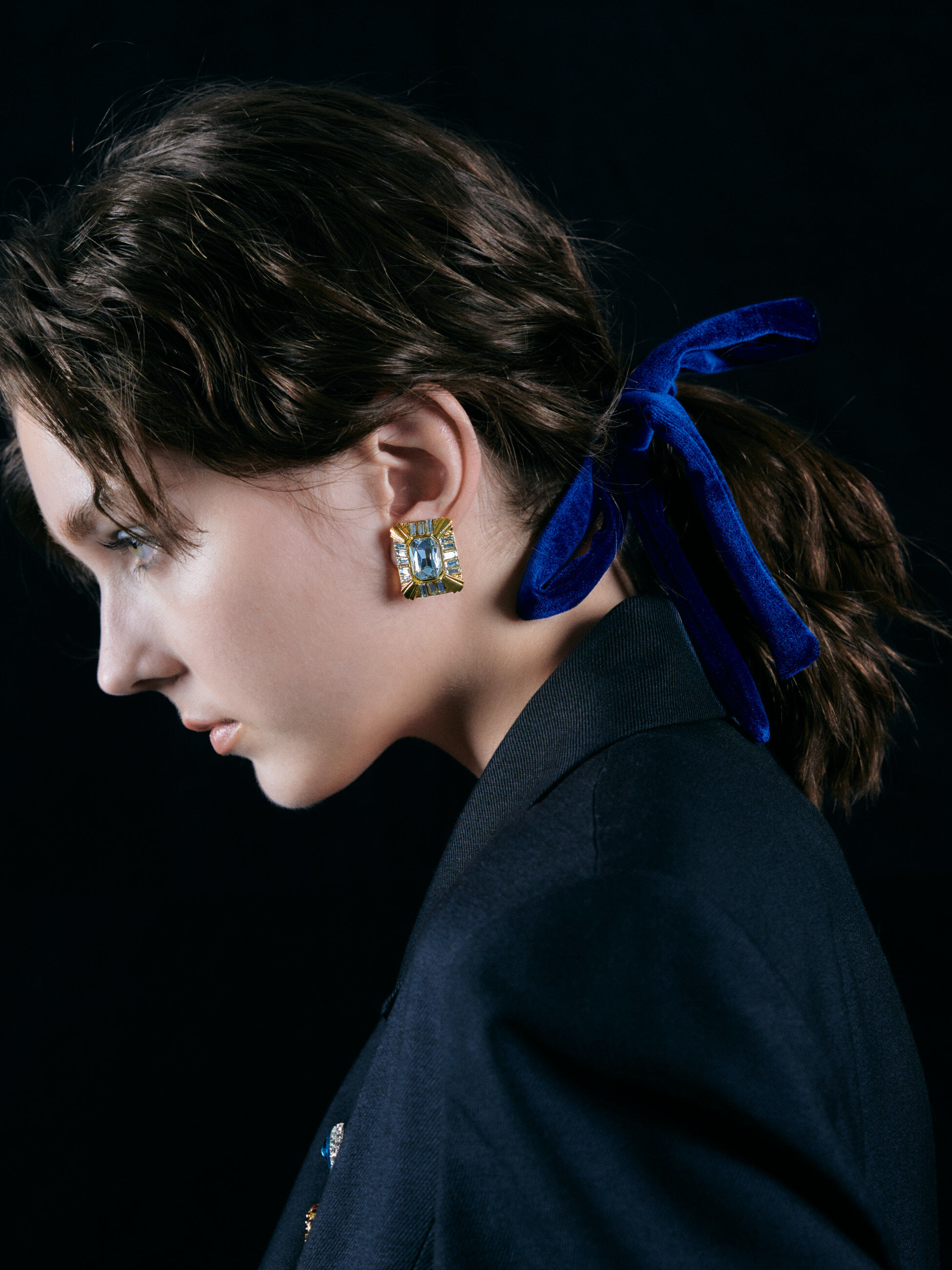 將閃閃發亮的玻璃寶石緊密排列,呈現出奢華感的耳夾。