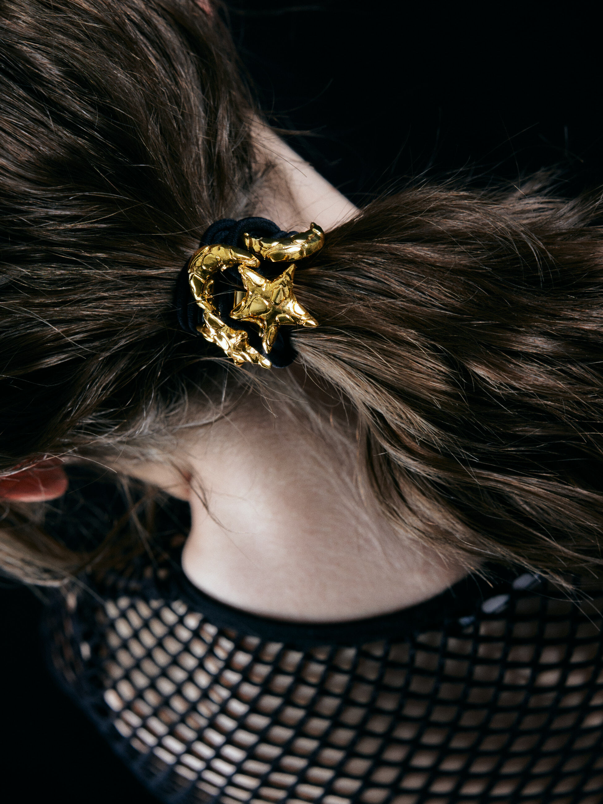 用具有良好感的橡膠將頭髮束起來,金屬圖案會聚集在一起,形成一個引人注目的焦點。
