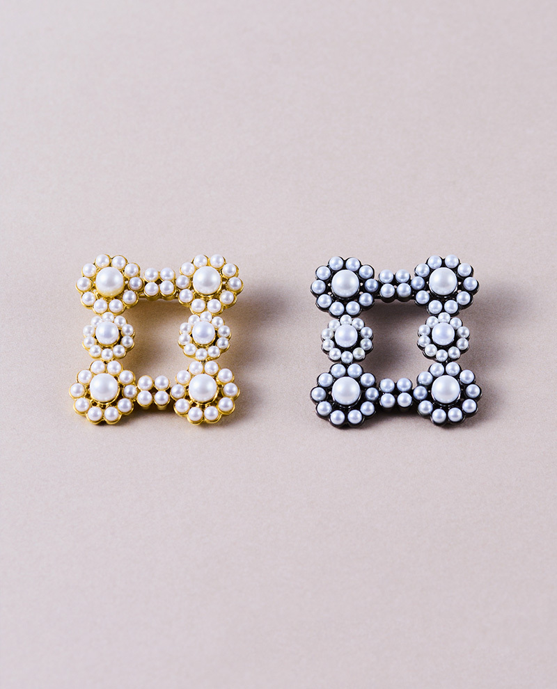 裝飾用途的胸針,靈感來自於帶扣。將不同大小的相思樹花朵規律地排列,打造含有知性印象的方形造型。