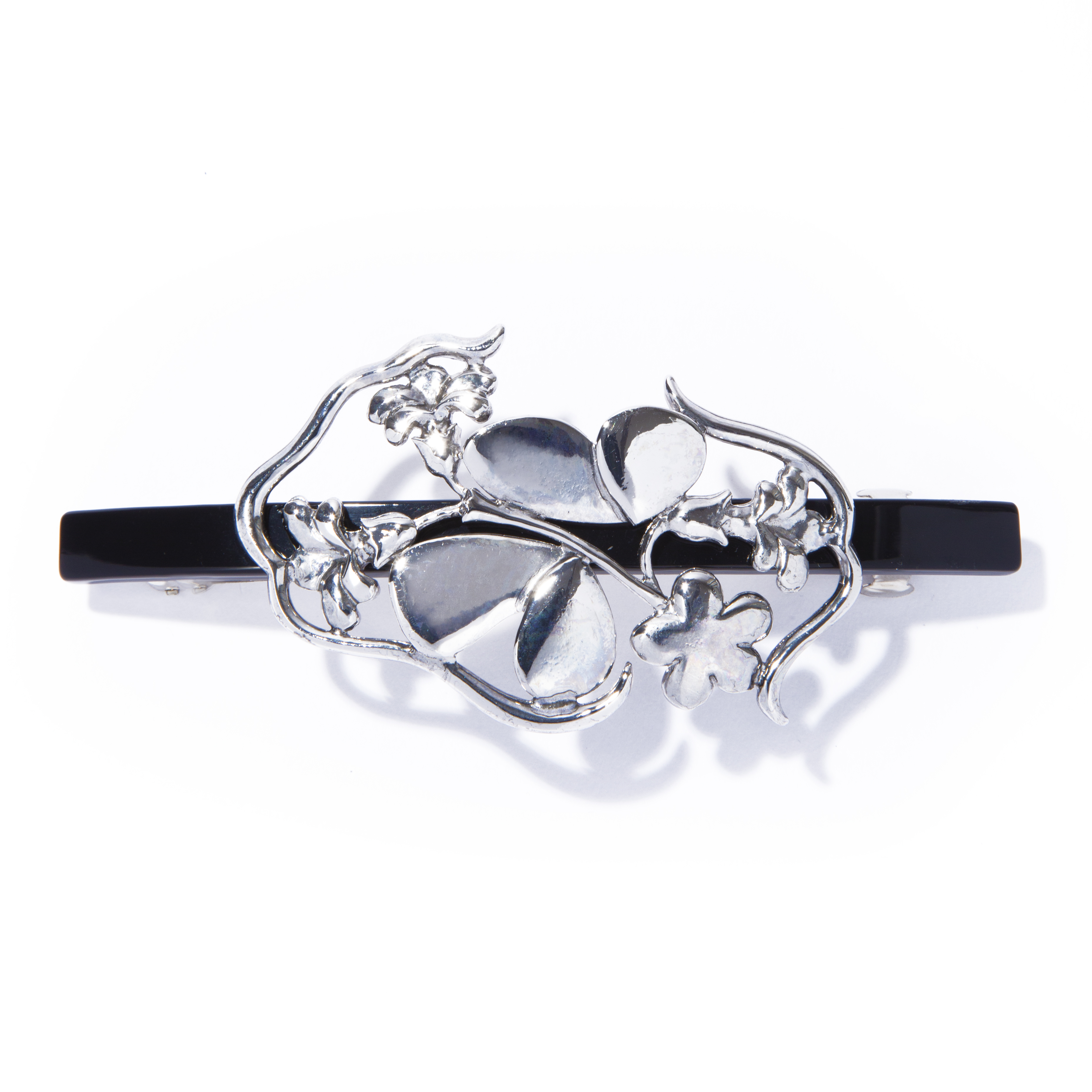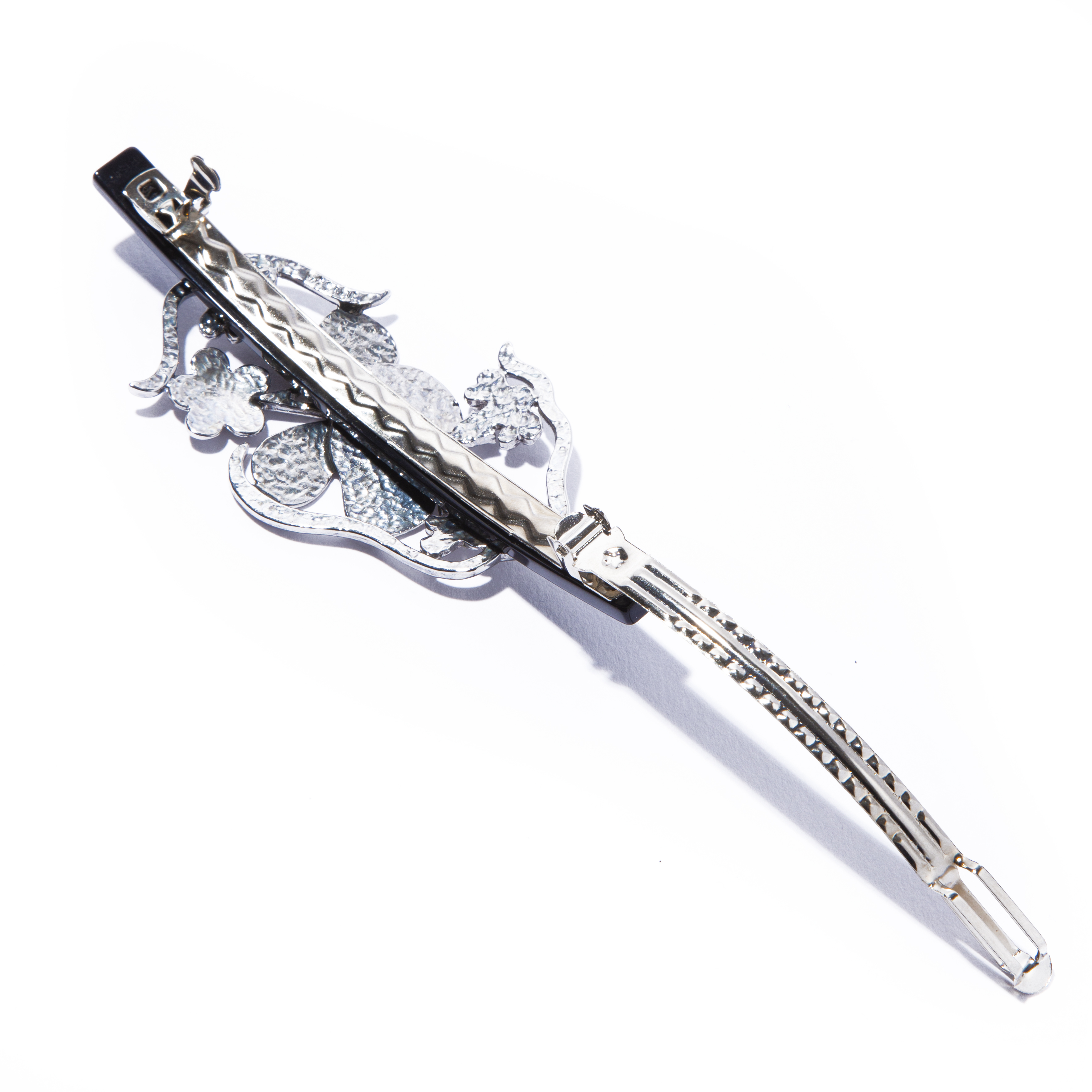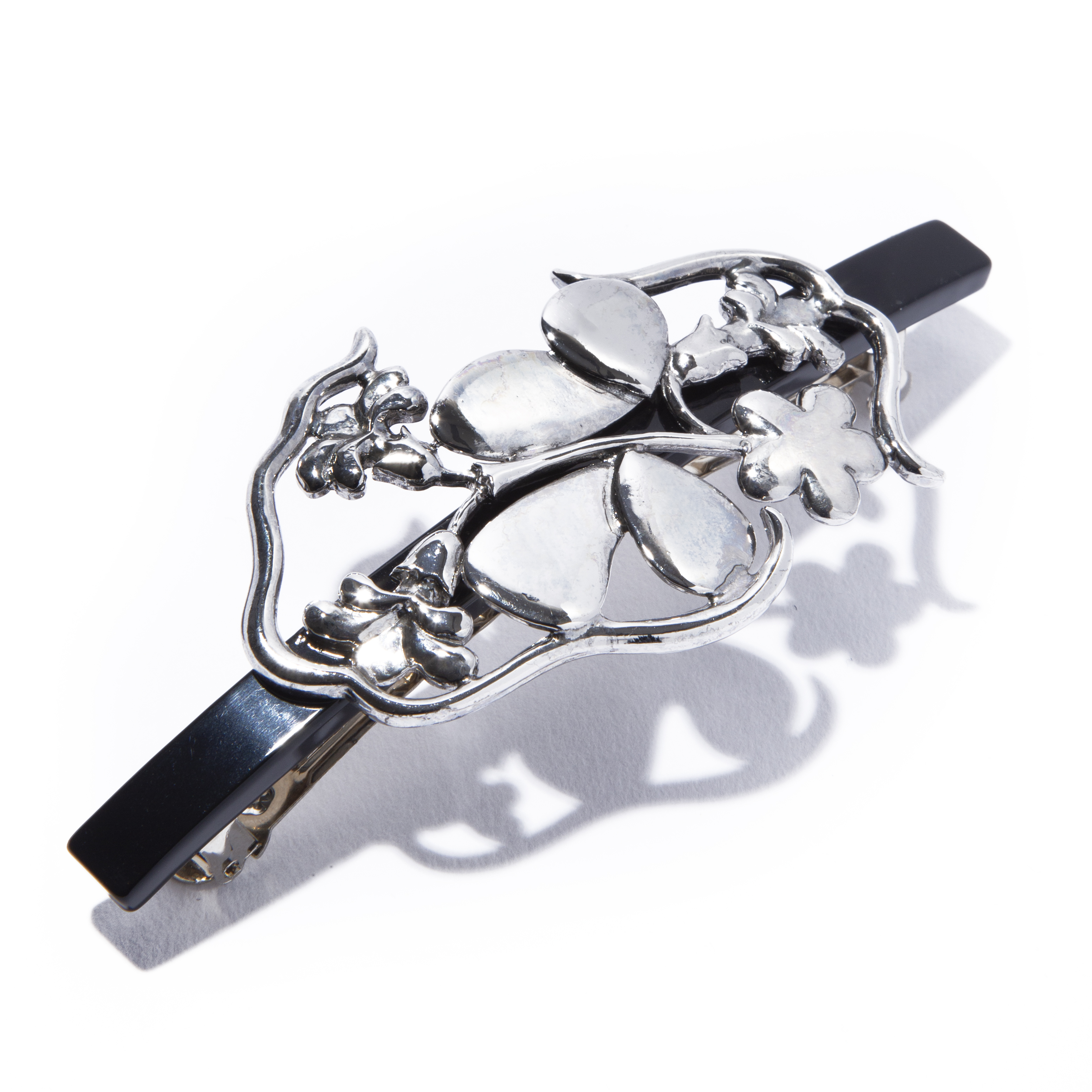 將東方的感性融入西方的現代主義,以花朵圖案的鏤空輪廓所設計出的髮夾。