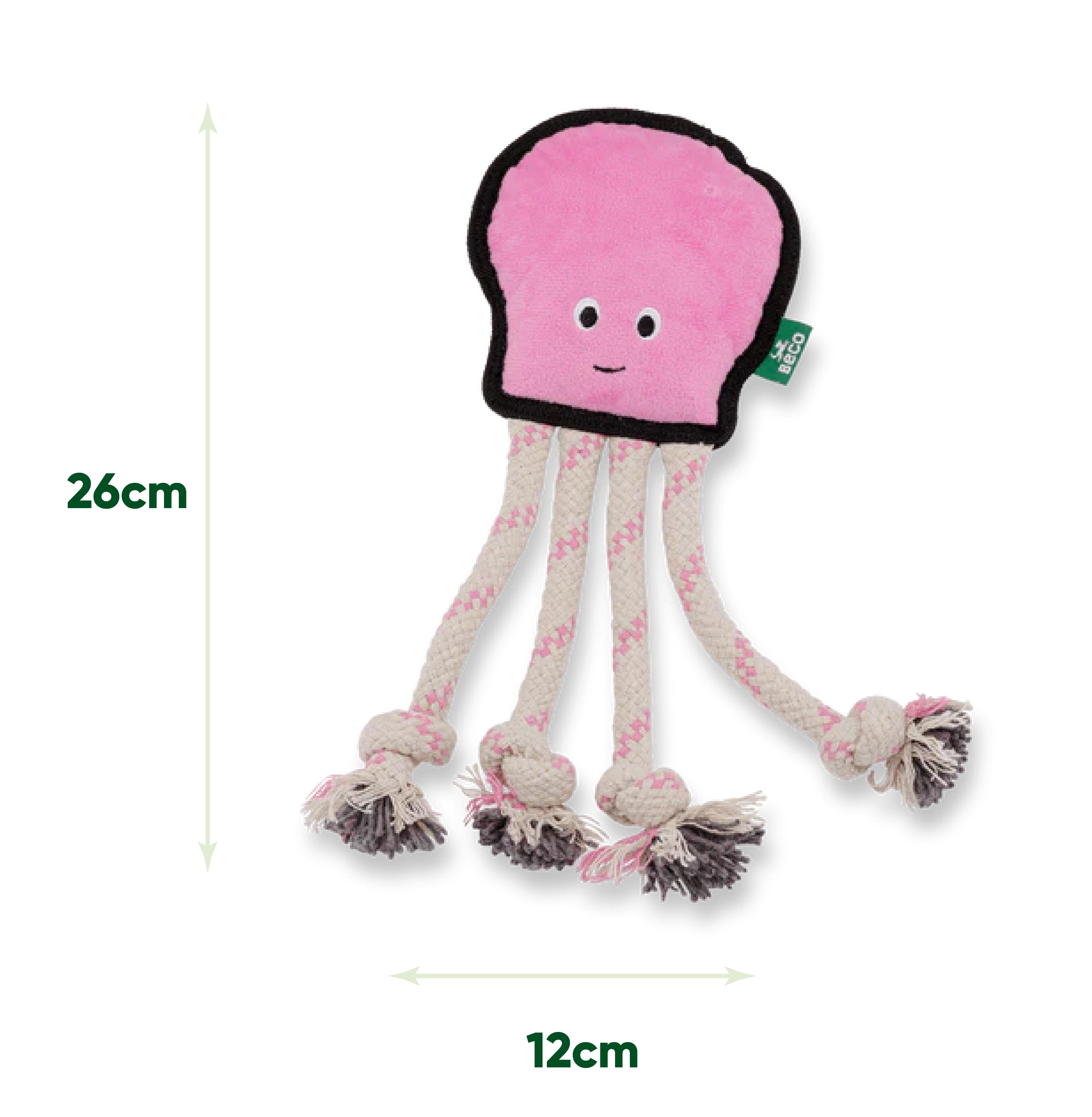 Beco 的環保寵物玩具皆由再生塑膠原料製成,毛孩開心玩耍也同時成為愛地球的一份子。章魚造型內含聲音裝置設計吸引互動,適當玩耍幫助穩定毛孩情緒降低焦慮。