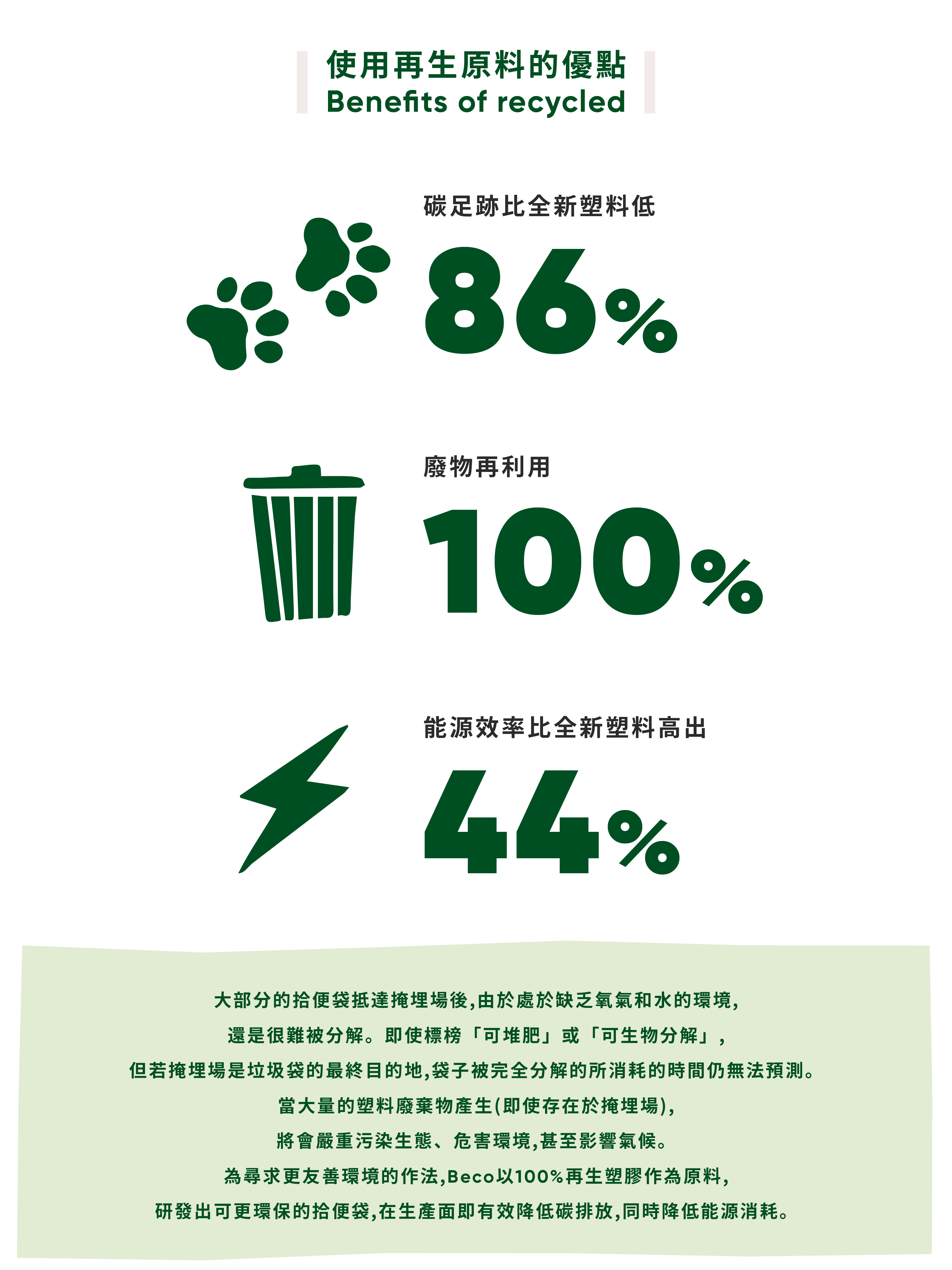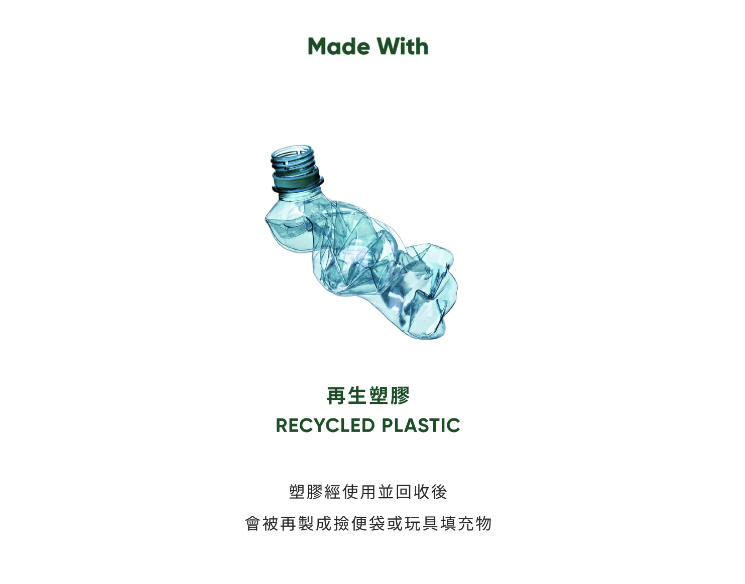 此款環保便便袋採用消費性塑膠回收再生後製成,
