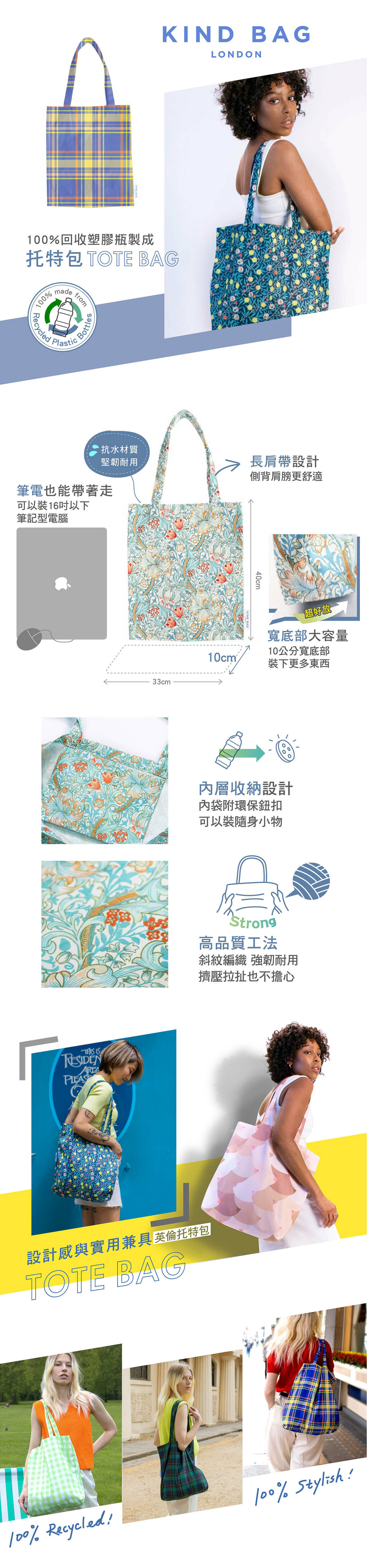 • 可重複使用、100% 回收的托特包既時尚又環保!擁有大容量、舒適的肩帶、防水和 30 度水溫機洗,採用各種精美印花設計,可滿足各種喜好。